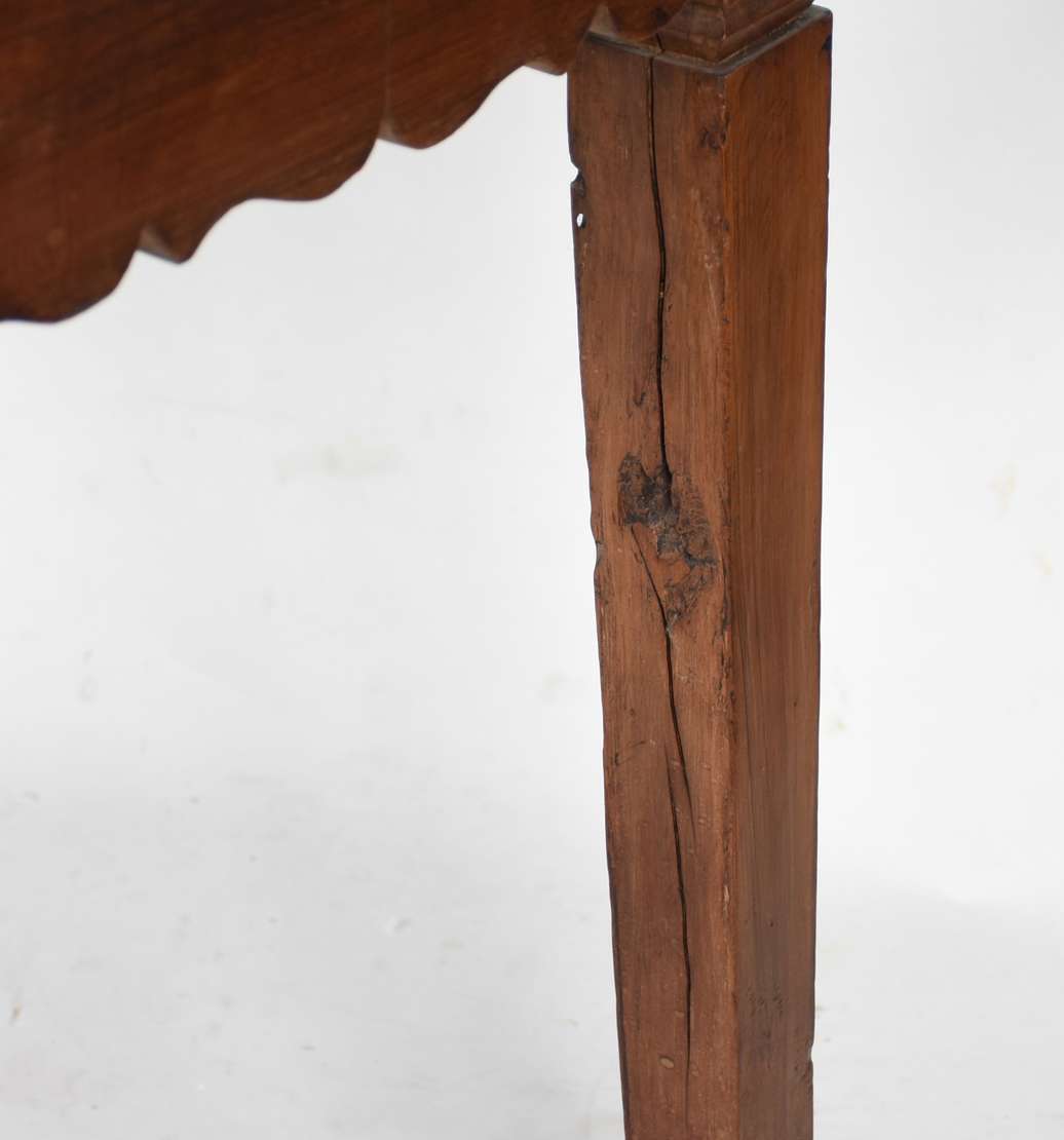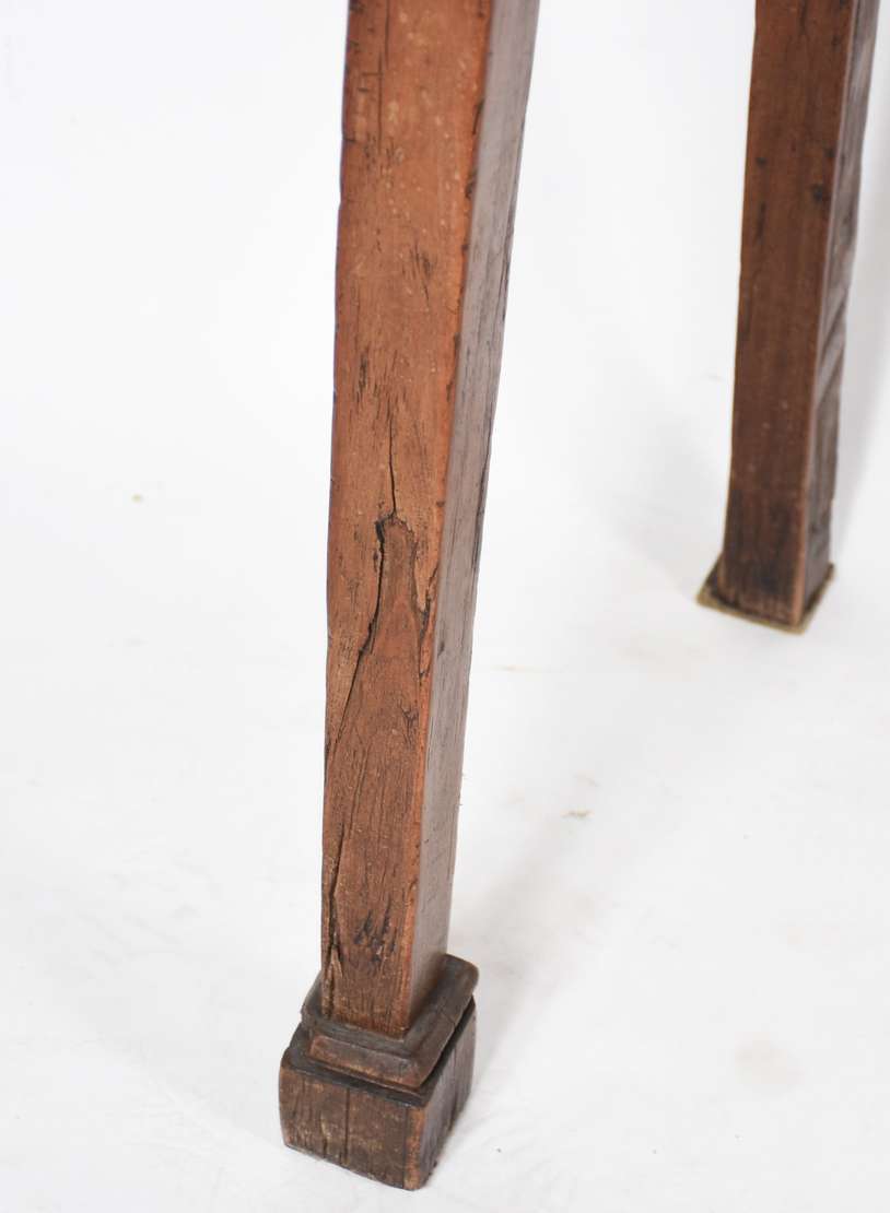 Mesa de centro de madeira nobre patinada, apoio em quatro figuras entalhadas de Cães de Fó, tampo de vidro.