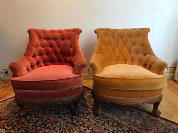 Par de poltronas estofadas e forradas com veludo, uma na cor mostarda e outra tijolo, encostos em capitoné. Base de m...