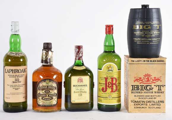 Cinco garrafas de whisky, sendo: Laphroaig 10 anos; Chivas Regal 12 anos; Buchanan's 12 anos, J & B; e Big "T".