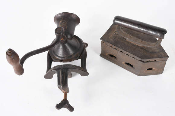 Duas peças antigas, sendo ferro de passar a carvão e, moedor de carne.