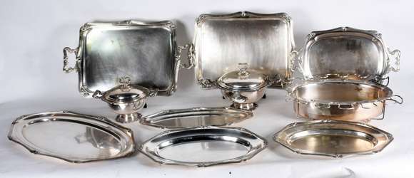 Diversas pecas , sendo 1 baixela de metal prateado Fracalanza. 4 travessas ovais, 1 travessa retangular com suporte, ...