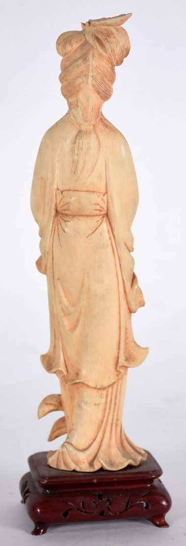Estatueta de marfim representando figura com facão, base de madeira. Assinado. Altura total 20 cm.