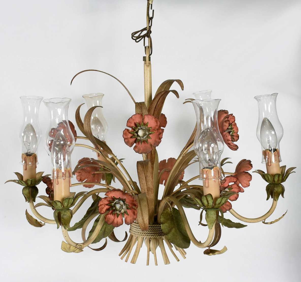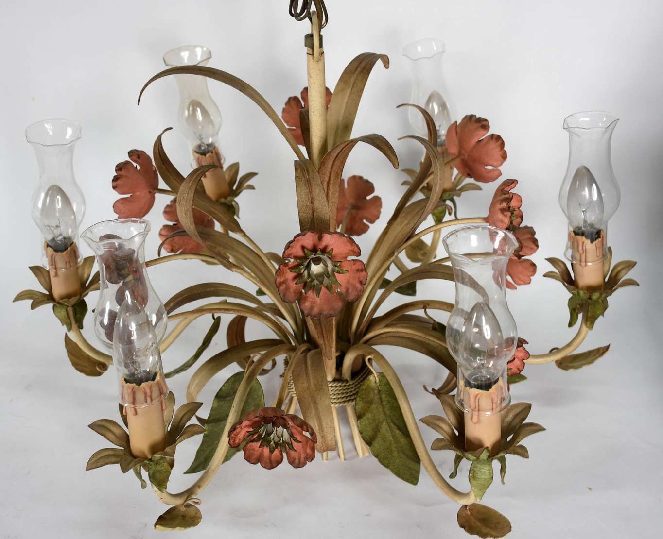 Lustre de metal dourado para 8 luzes, mangas de pergaminho.