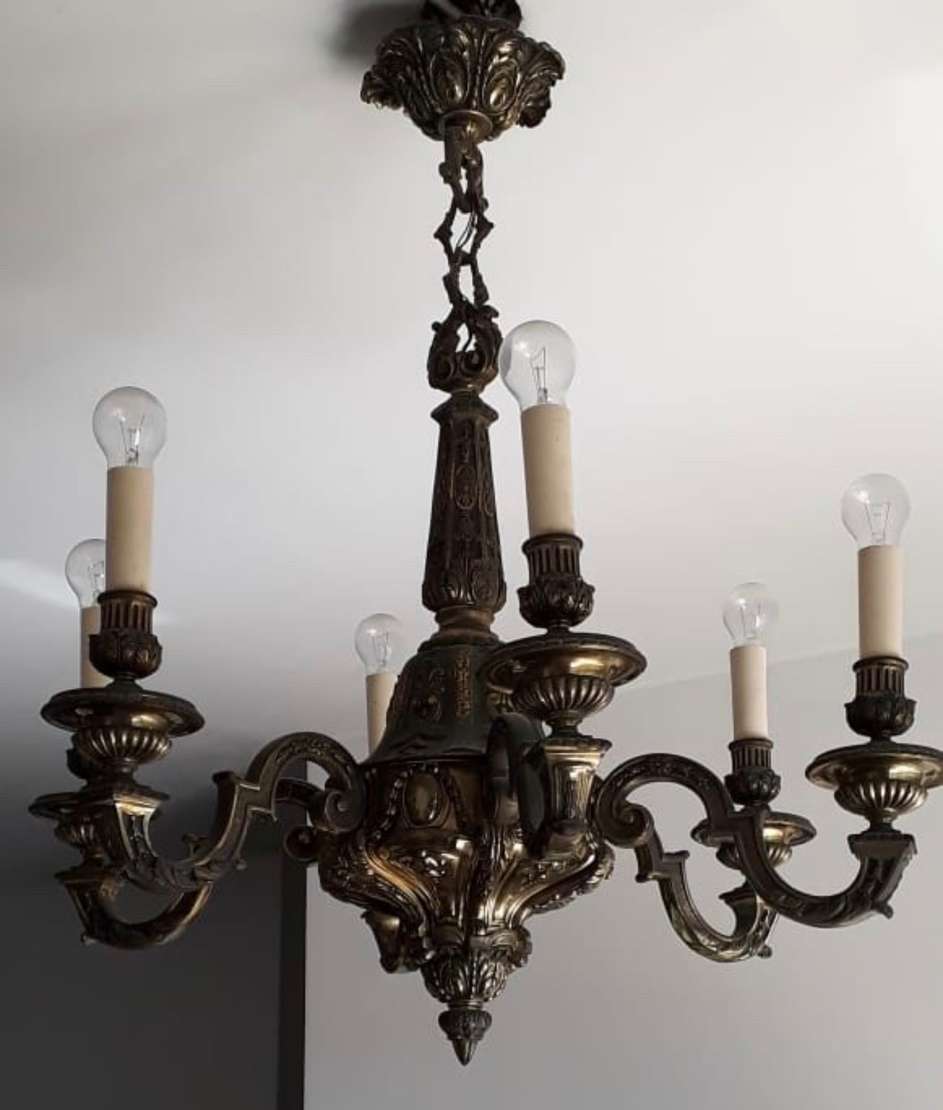 Lustre de bronze para 6 luzes. (Retirada em apartamento na Barra da Tijuca).