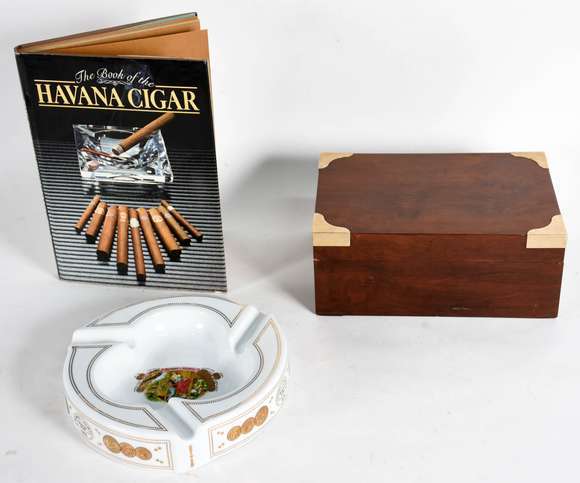 Tres peças diversas, sendo: caixa com desumidificador inglês para charutos, cinzeiro de porcelana para charutos e liv...