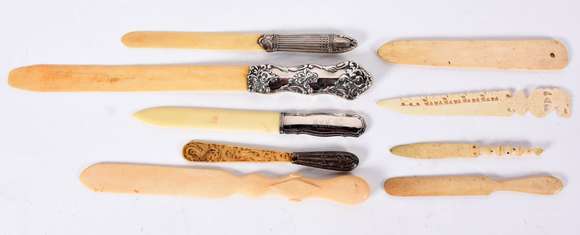 Nove corta papeis de marfim sendo quatro com cabos de prata.