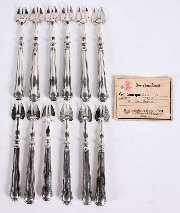 Doze garfos de ostra de prata contrastada. (por motivos de segurança a peça não fica na loja)