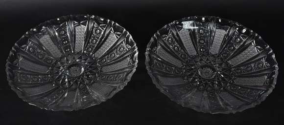 Par de fruteiras em cristal da Bohêmia, lapidado com navetes, palmas e estrelinhas serrilhadas (leves bicados na borda).