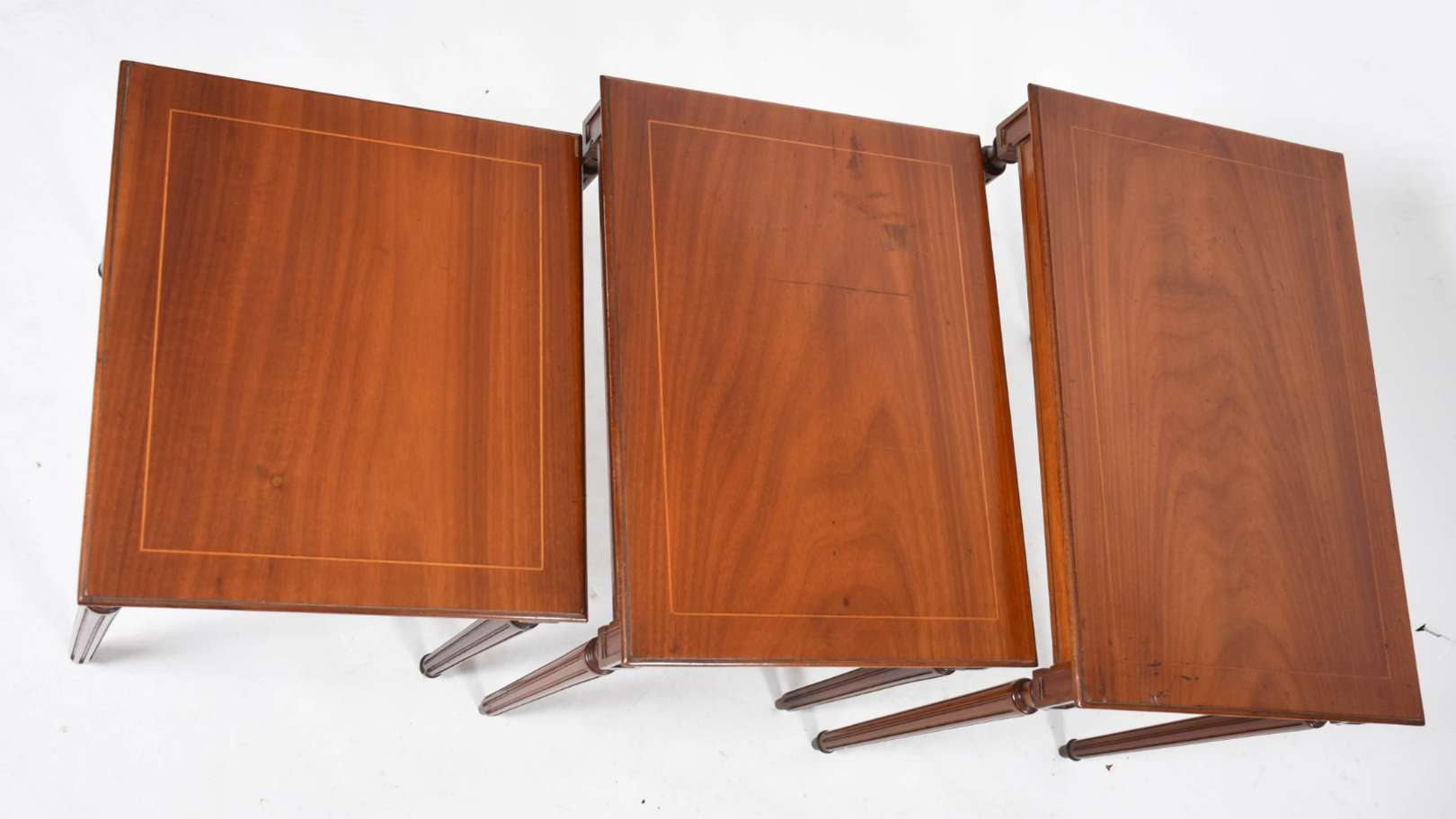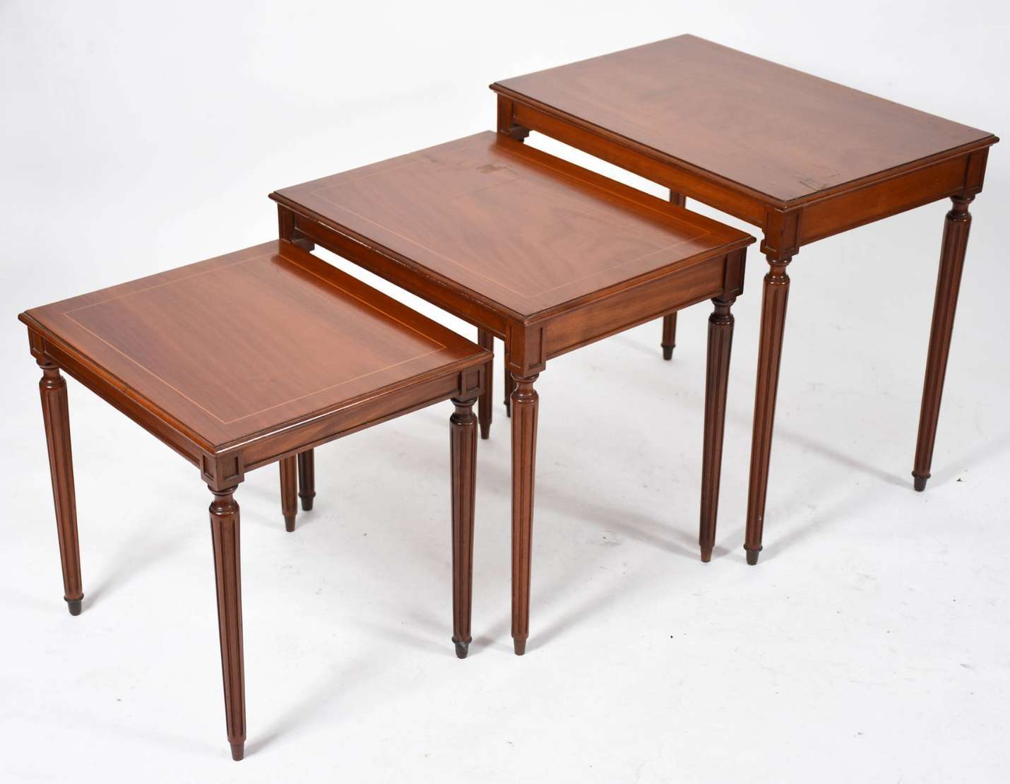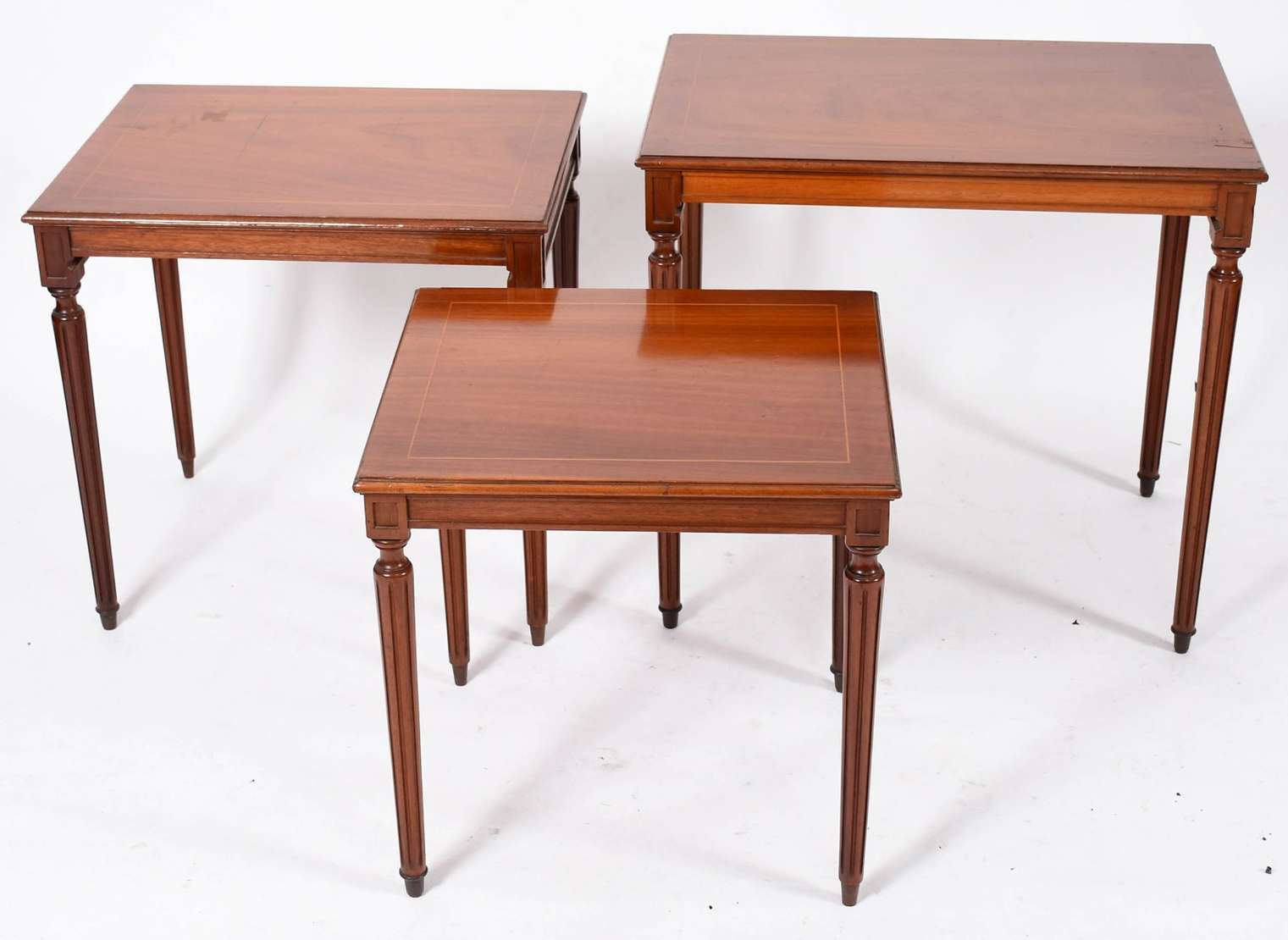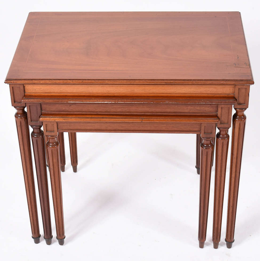 Mesinha auxiliar de madeira nobre com pernas torneadas e incrustações em metal.