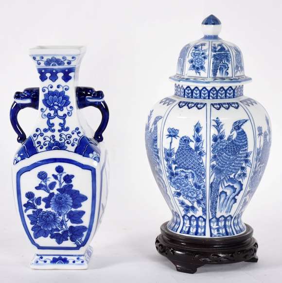 Duas peças sendo potiche e vaso de porcelana oriental azul e branca.
