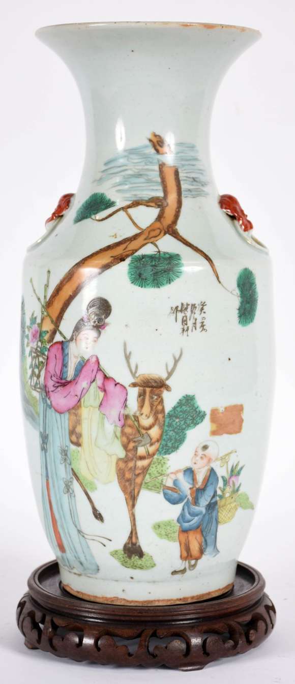 Vaso de porcelana oriental decorado com figuras típicas e animal, ideogramas, base de madeira.