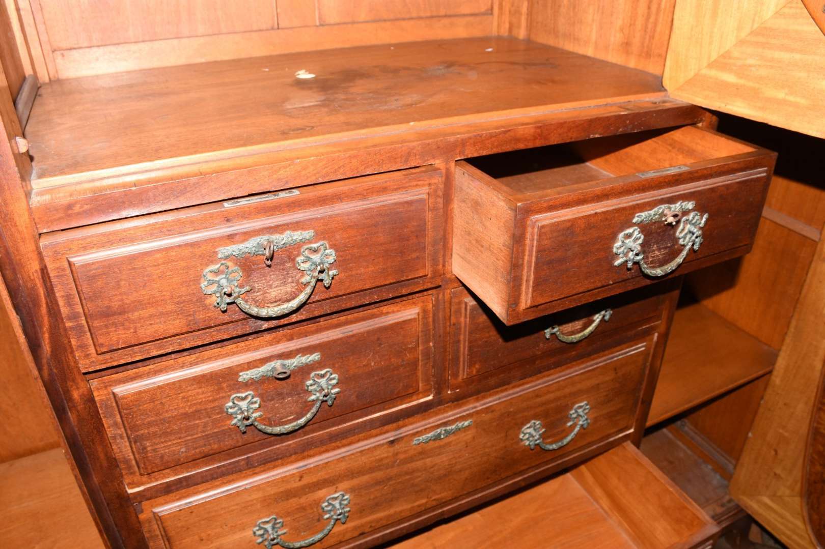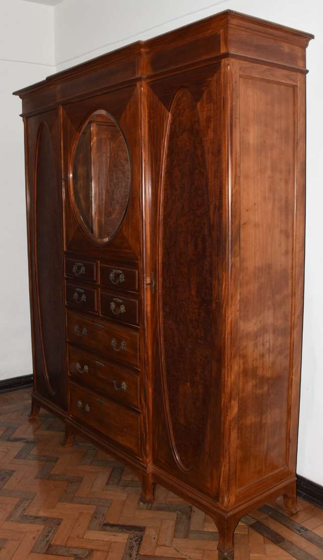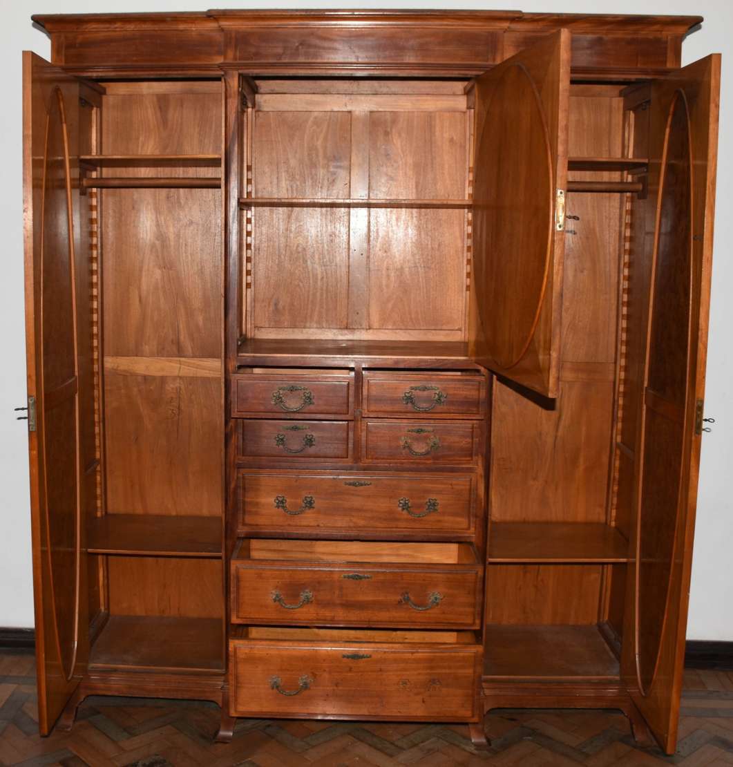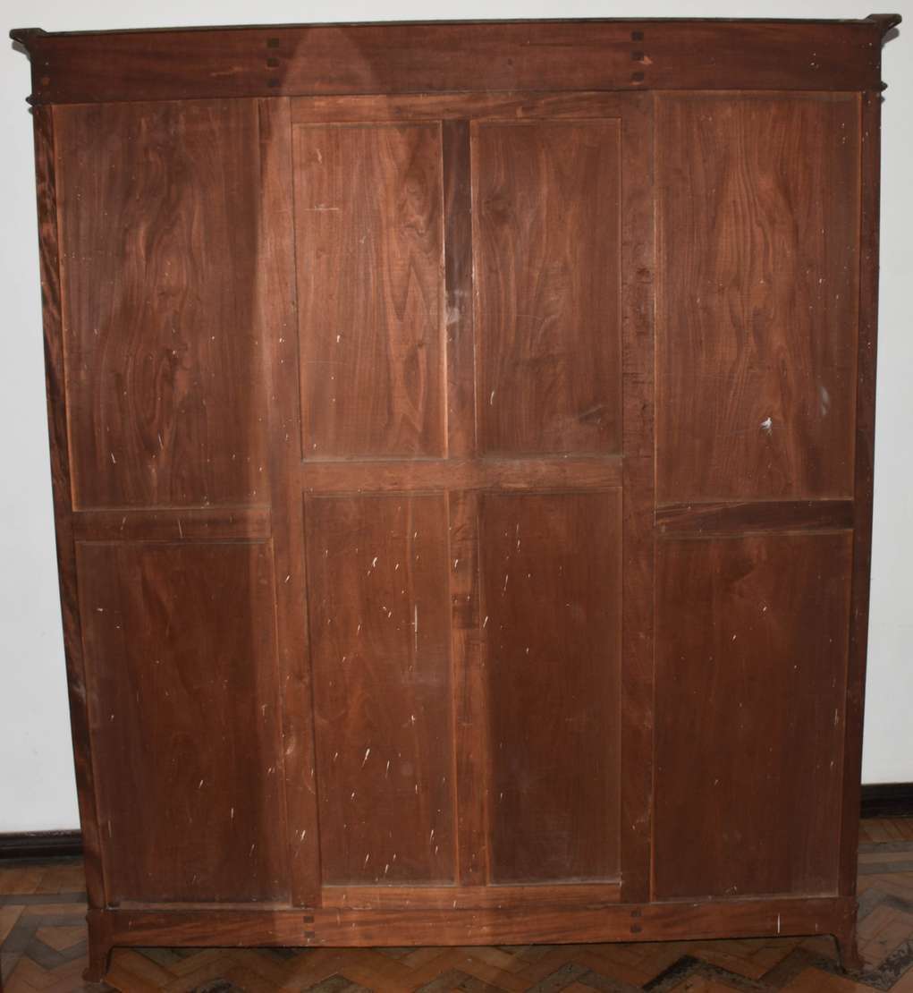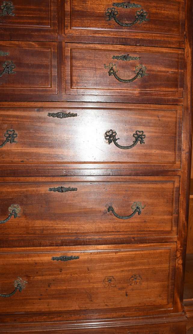 Imponente e grande móvel de madeira nobre, parte inferior com duas portas almofadadas e duas gavetas, tampo de mármor...