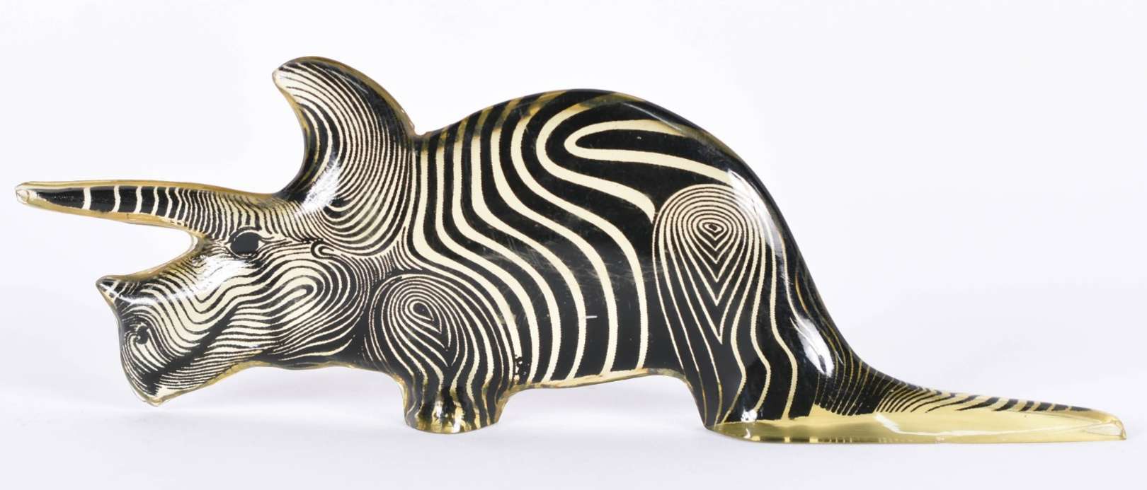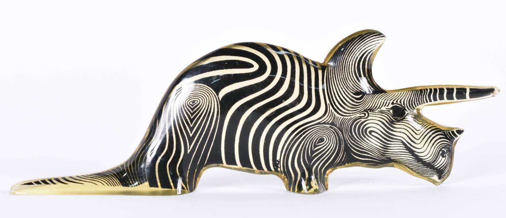 Estatueta de resina de poliéster representando dinossauro, assinada.