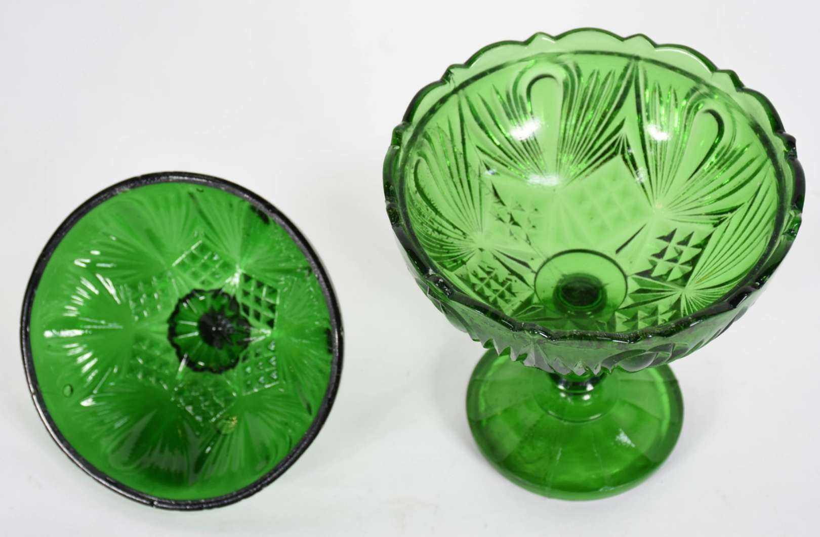 Par de fruteiras em cristal da Bohêmia, lapidado com navetes, palmas e estrelinhas serrilhadas (leves bicados na borda).