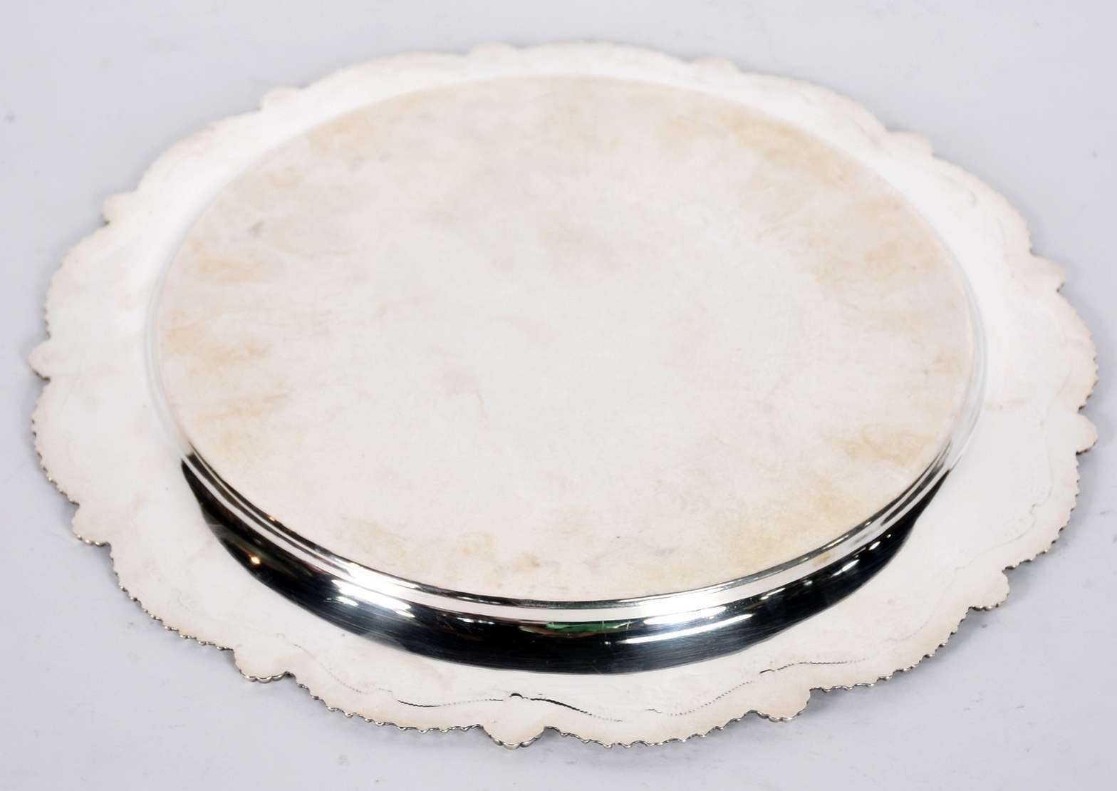 Duas peças diversas, sendo decanteur de vidro (com bicados) e fruteira com haste central de metal prateado e tres pla...