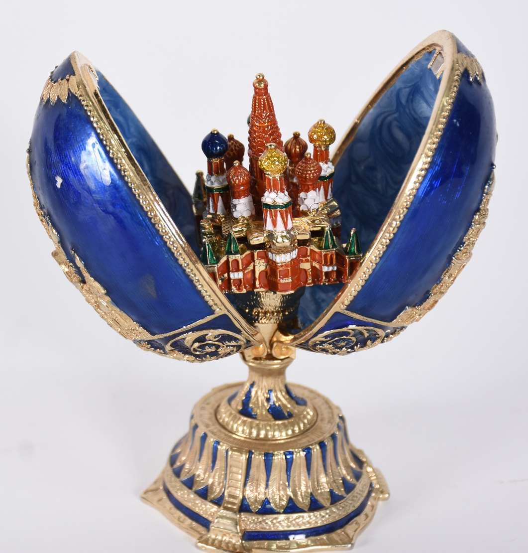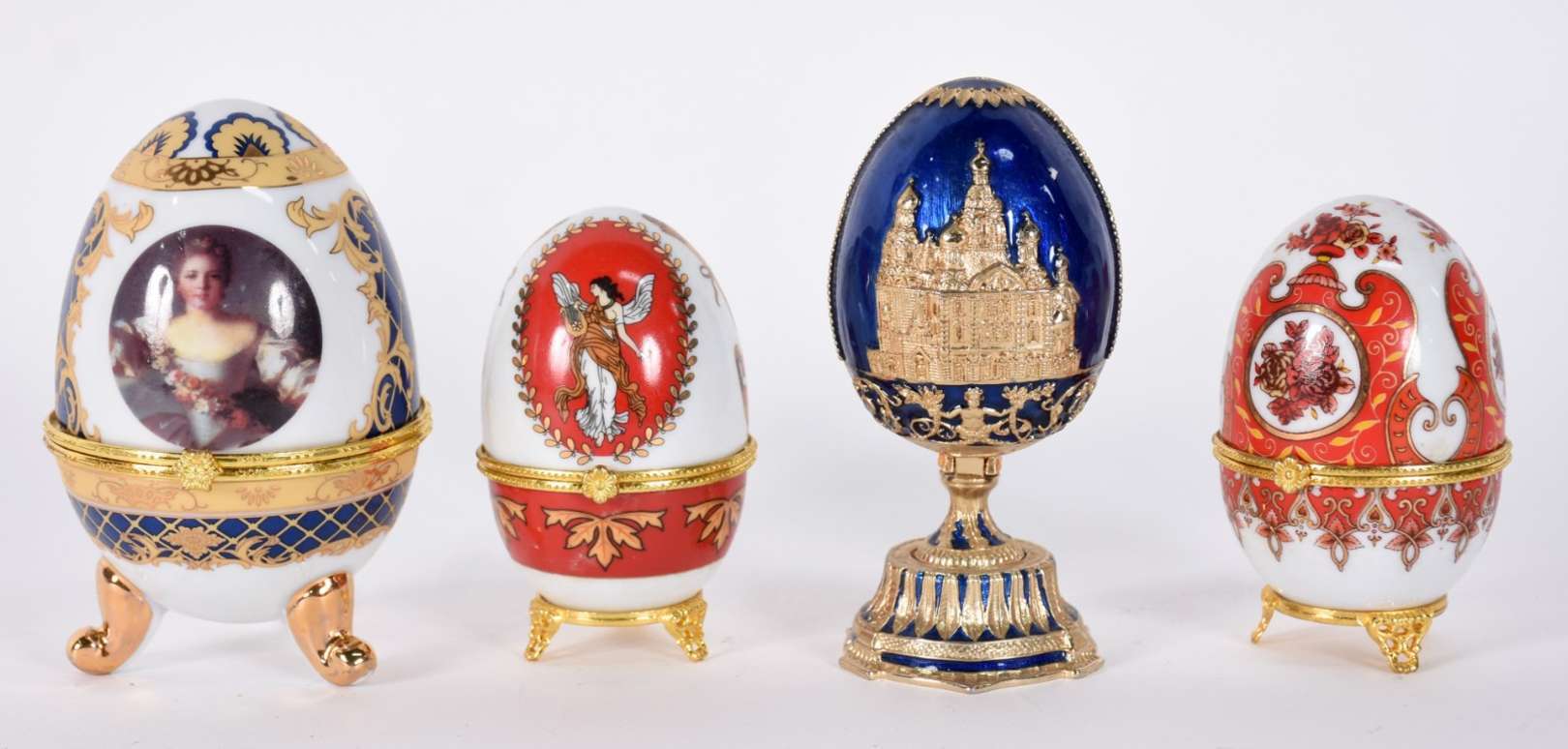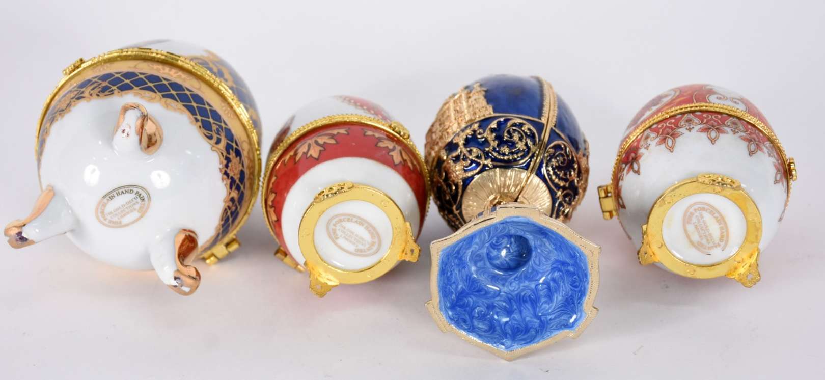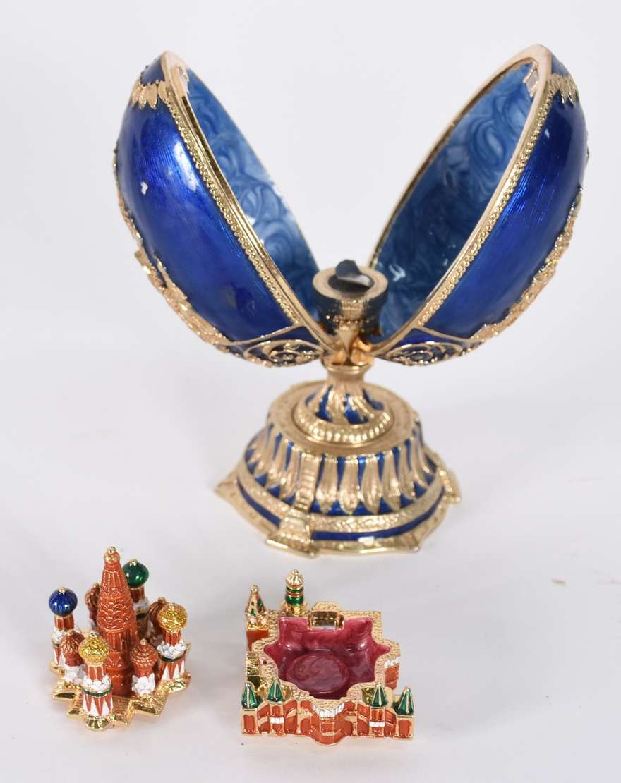 Porta joias de metal dourado ricamente trabalhado com placa de porcelana sobre veludo na parte superior, feitio oitav...