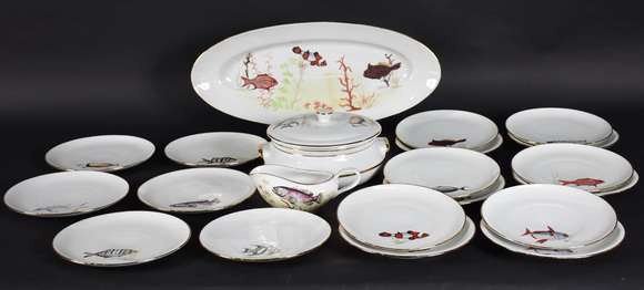 Serviço de jantar de porcelana RENNER composto de: 21 pratos rasos, 9 pratos fundos, 20 prato de sobremesa, 3 travessas fundas e 1 molheira, 1 sopeira com tampa e 1 bowl. Total 56 peças.