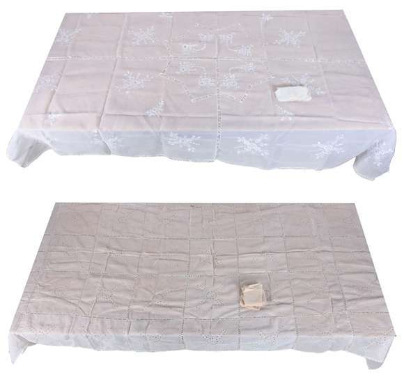 Duas toalhas de mesa de organza, sendo uma na cor branca com 3 guardanapos (com manchas) e outra bege (com furos) c...