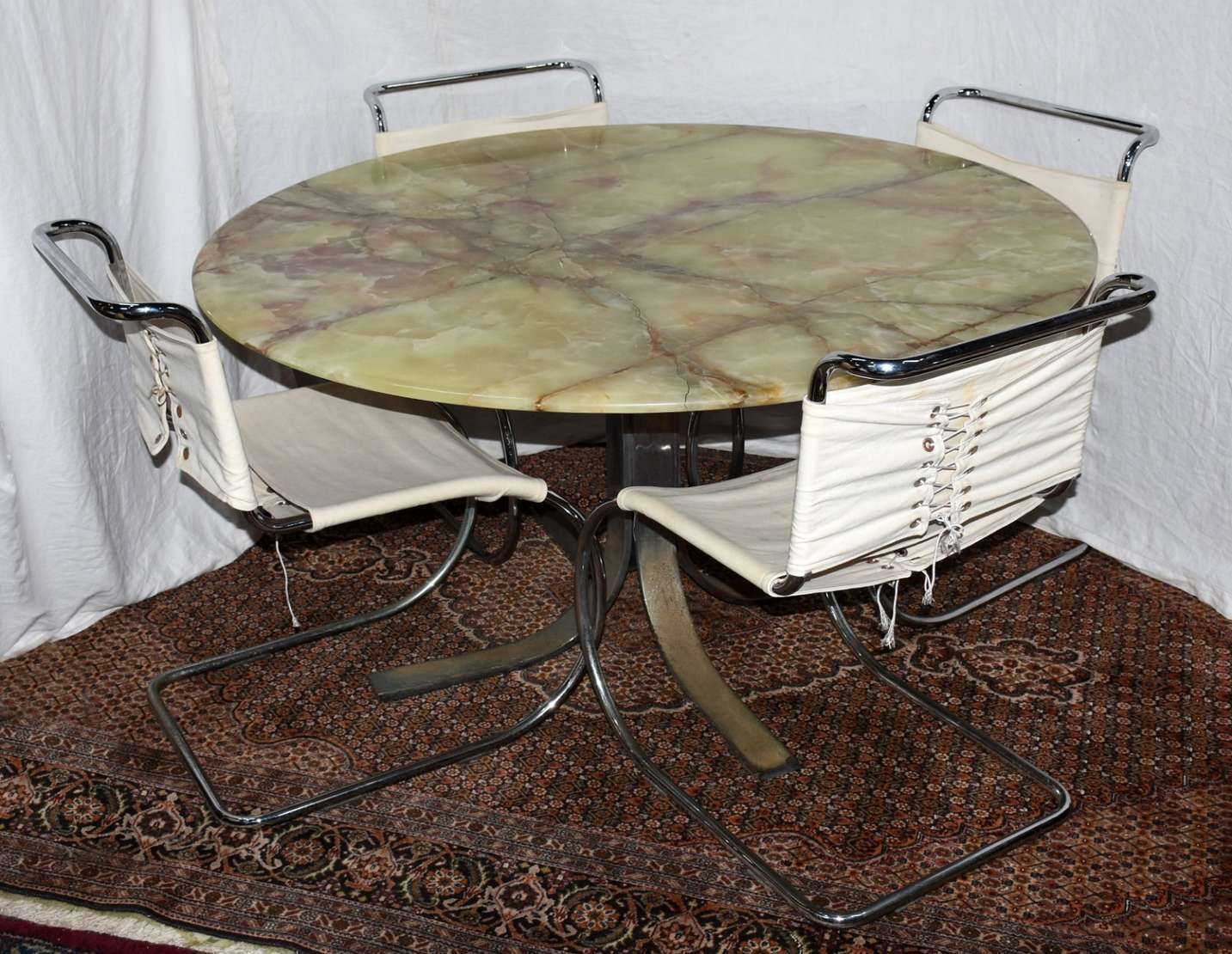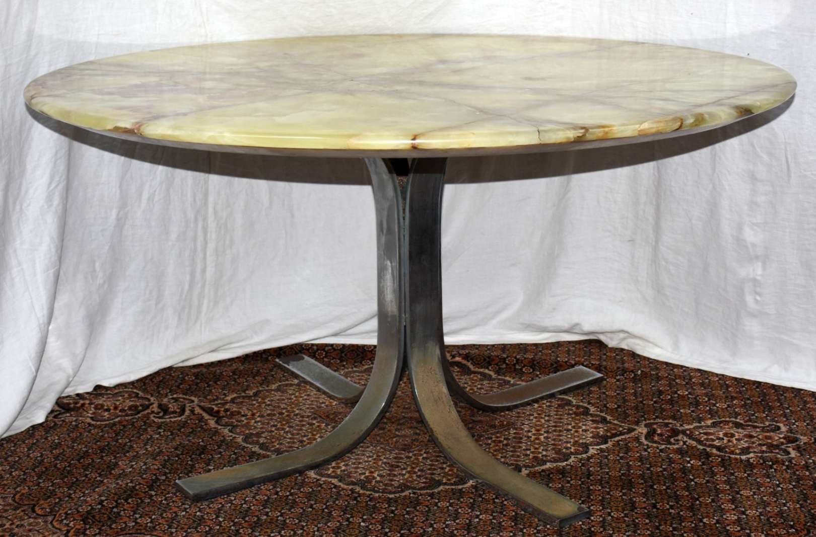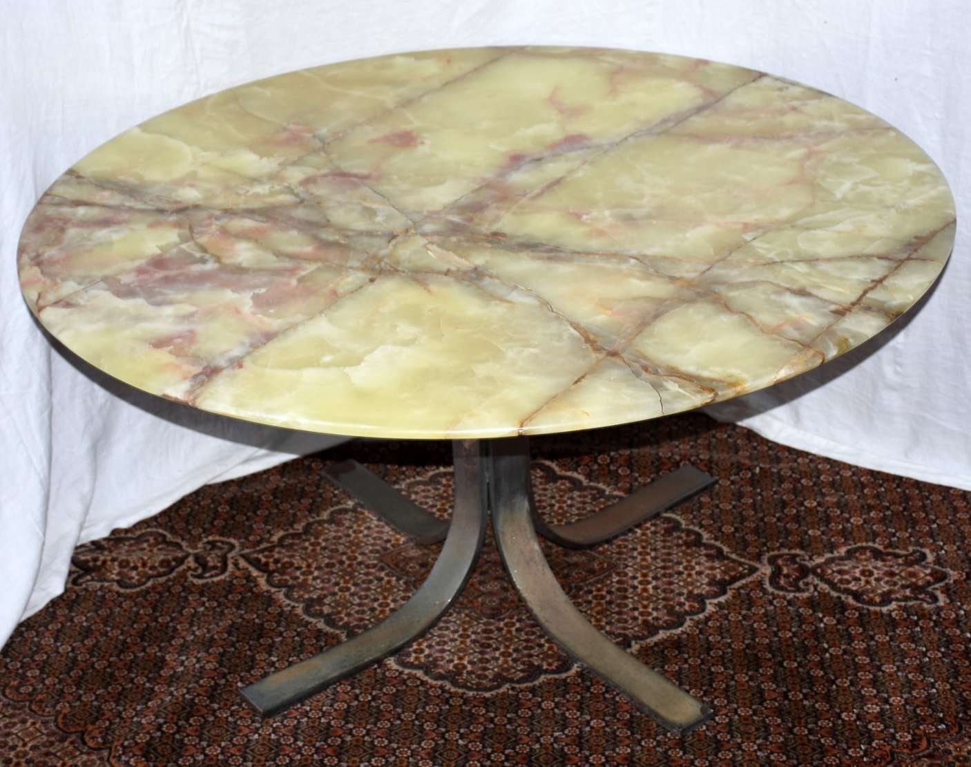 Mesa com pé de metal pintado e tampo de mármore negro rajado (pequeno lascado na borda e pé oxidado precisando reparo).
