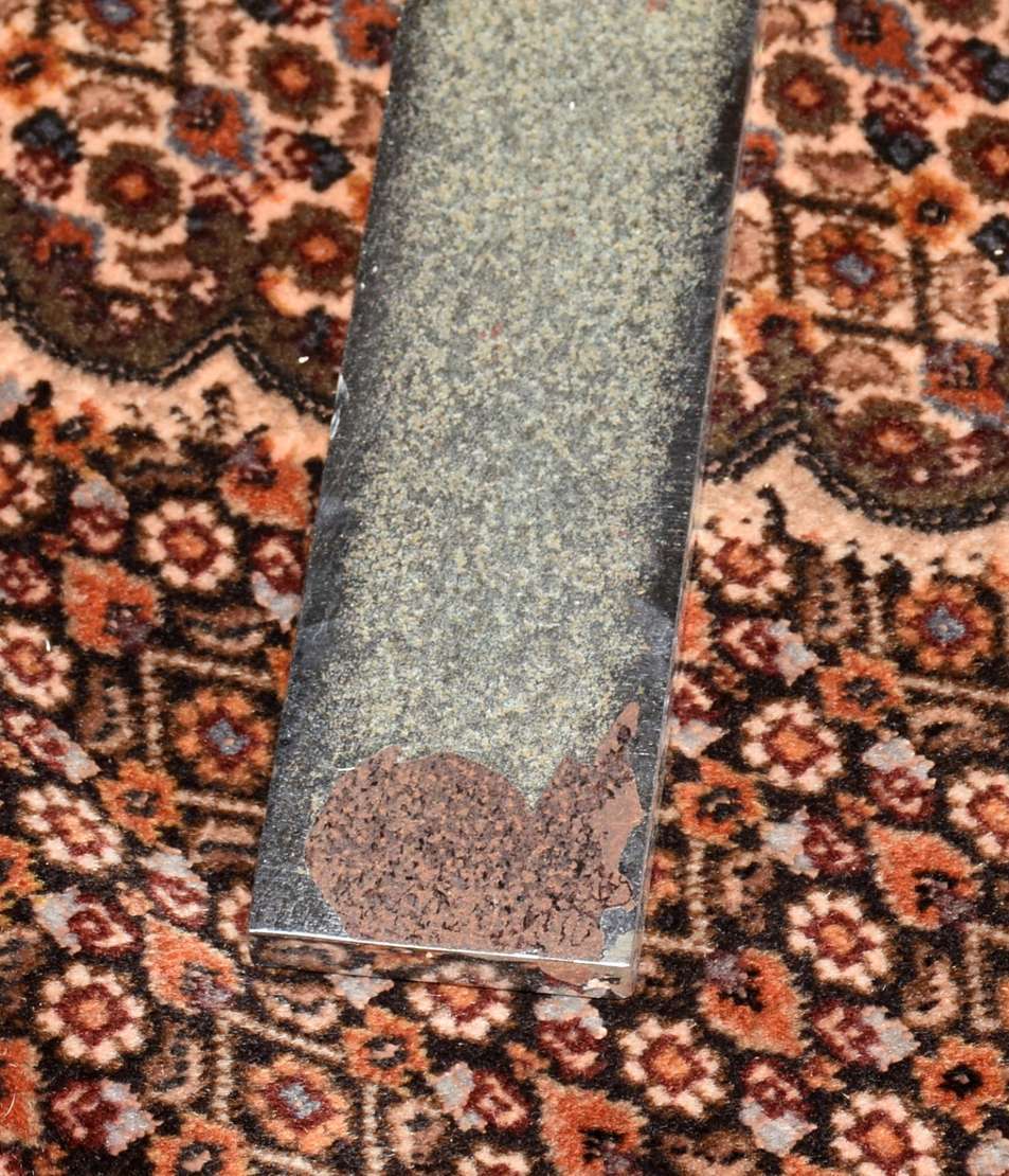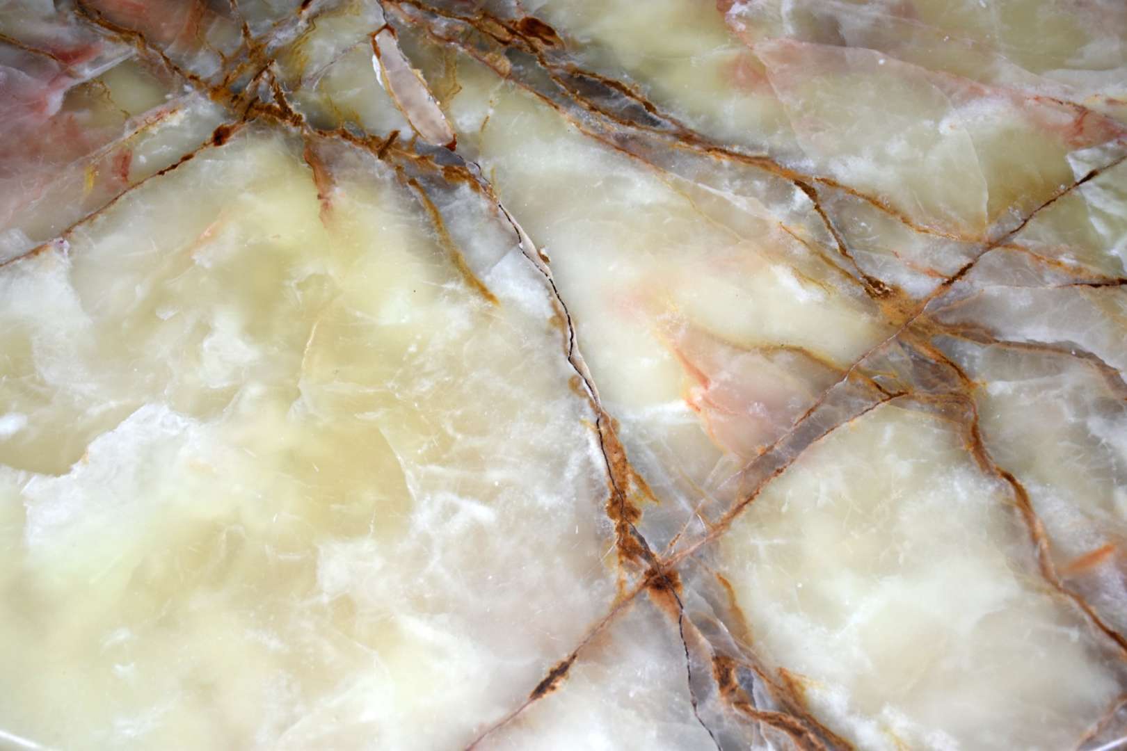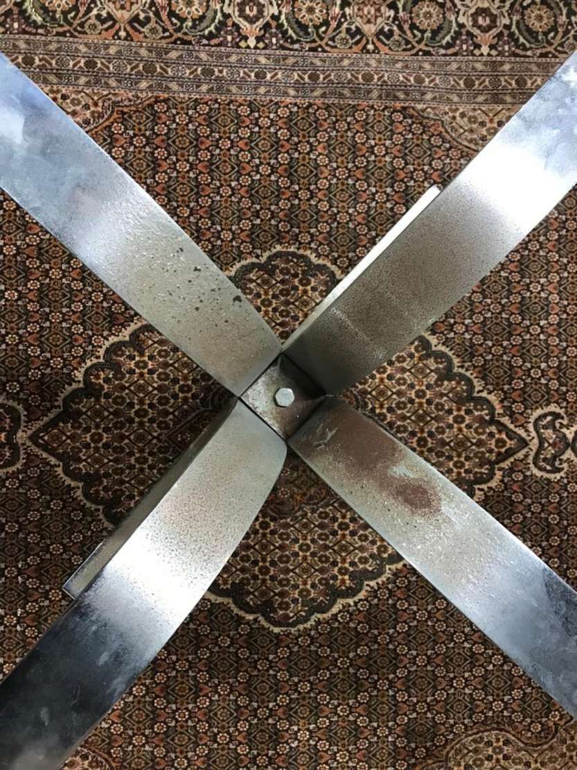 Mesa com pé de metal pintado e tampo de mármore negro rajado (pequeno lascado na borda e pé oxidado precisando reparo).