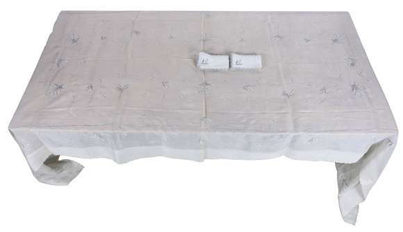 Elegante toalha de mesa de organza na cor areia com bordados em branco e prateado, acompanham vinte e quatro guardana...