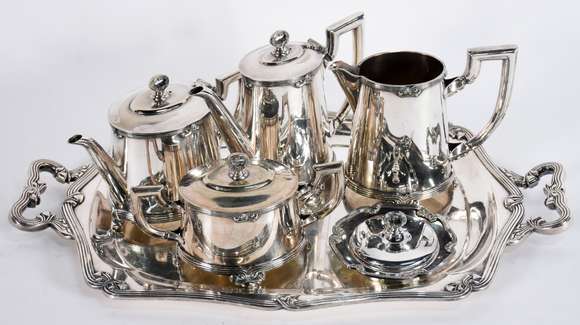 Baixela de chá e café de metal prateado Fracalanza composto de: Dois bules, leiteira, açucareiro, manteigueira (sem o...