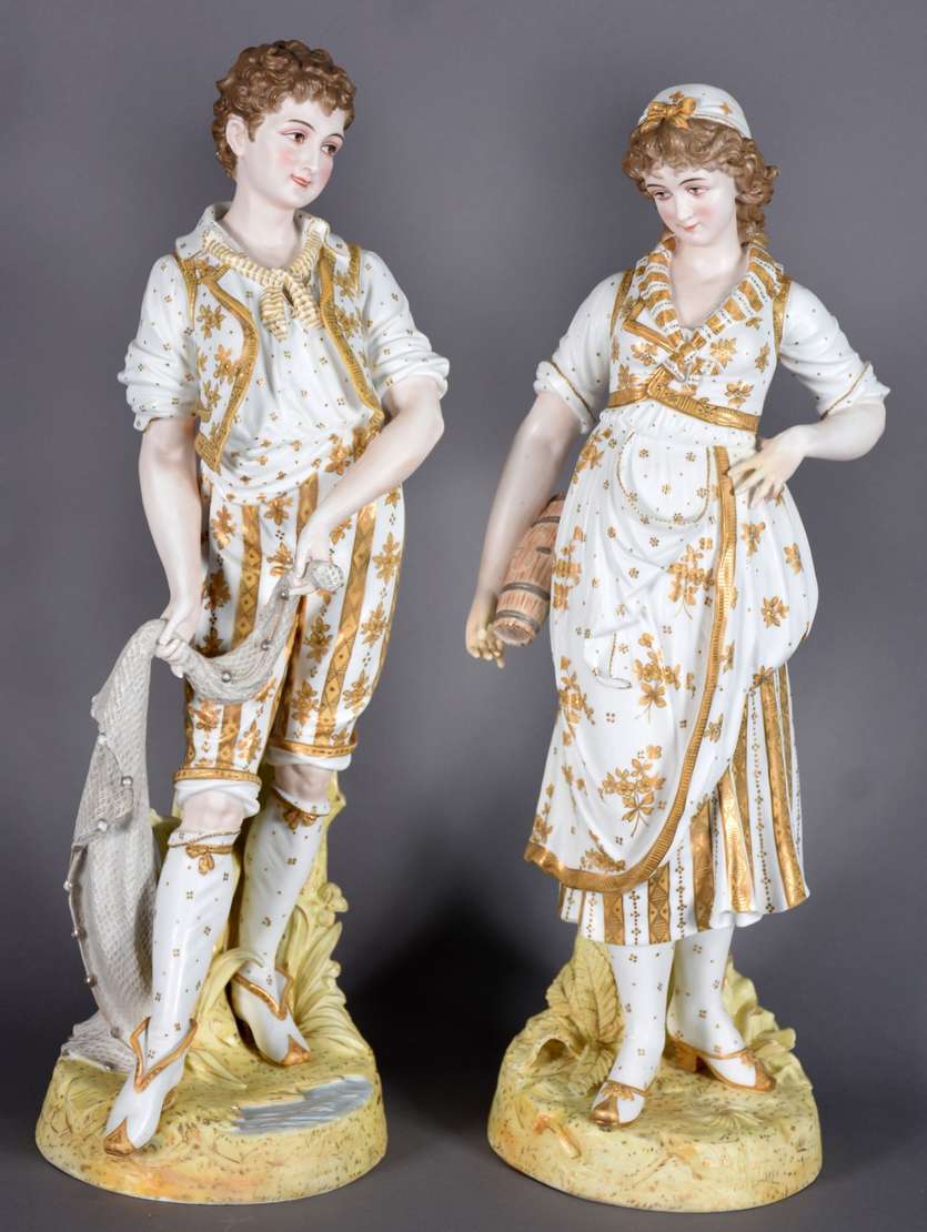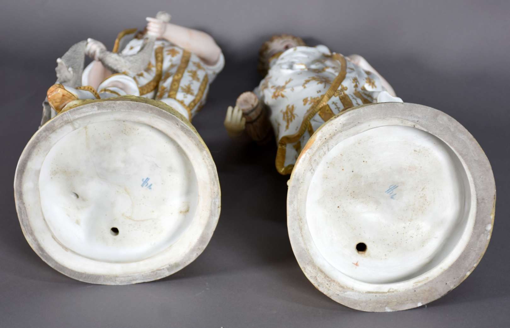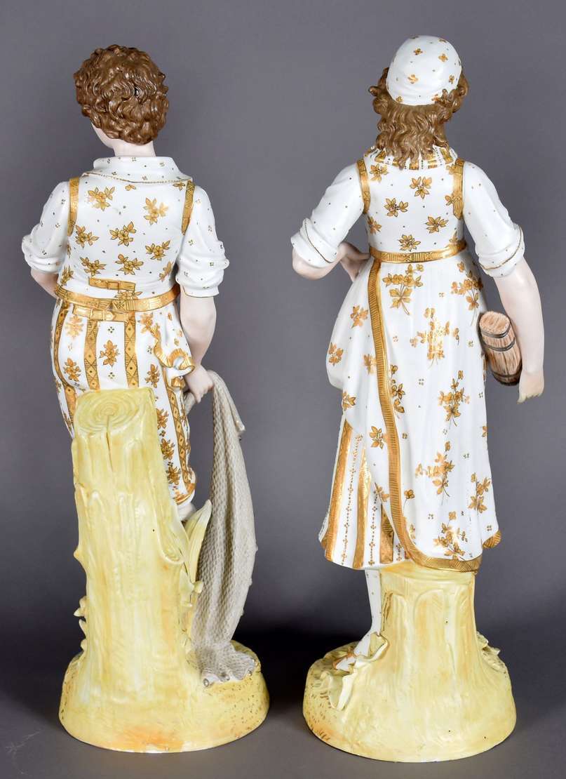 Estatueta de porcelana americana policromada representando duas mulheres sustentando grande vaso decorativo. Marca na...