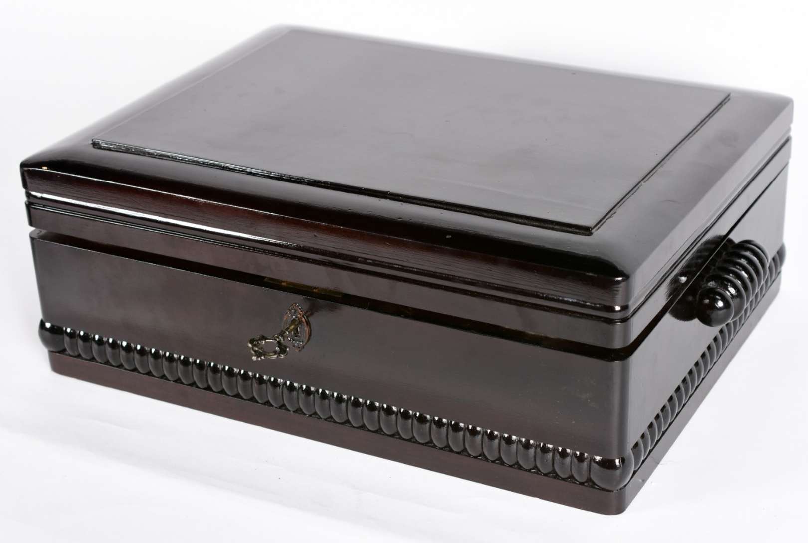 Porta joias de metal dourado ricamente trabalhado com placa de porcelana sobre veludo na parte superior, feitio oitav...