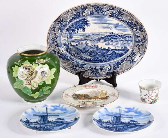 Diversas peças de porcelana, sendo : Um potiche alemão da Bavaria, marca Kunst, na cor verde com flores em policromia...
