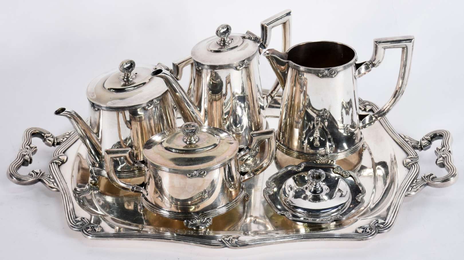 Belíssima baixela de chá e café de prata francesa contrastada, ricamente trabalhada com guirlandas florais nas bordas...