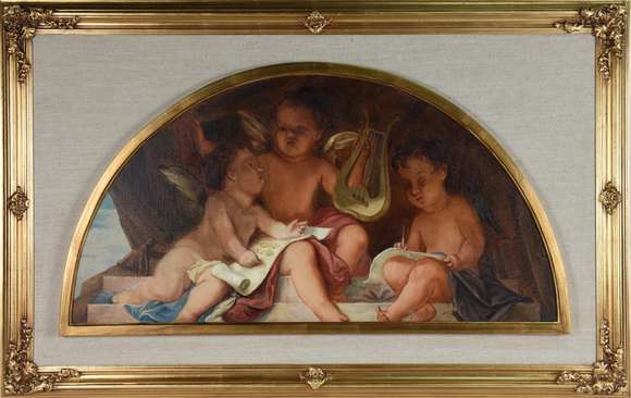 Placa sacra com rosto de Cristo em metal e moldura de madeira.