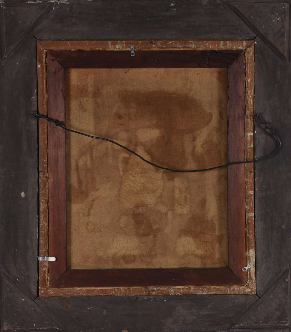 Placa sacra com rosto de Cristo em metal e moldura de madeira.