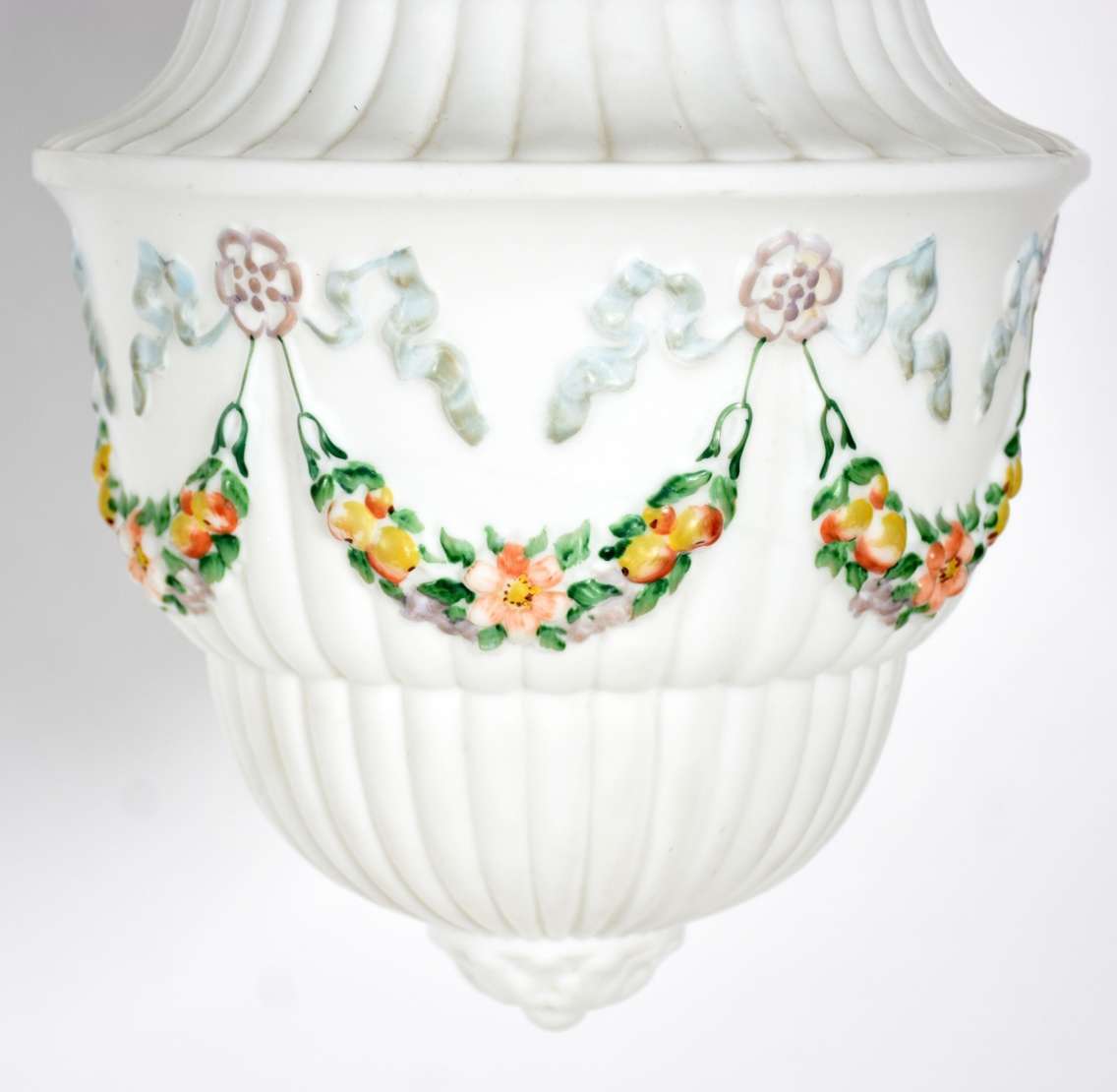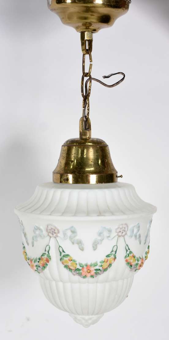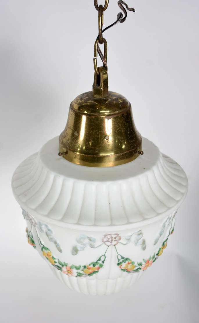 Abatjour de opalina branca com guirlandas e busto de jovem em policromia, globo de vidro lavrado e detalhes de metal...