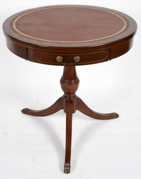 Mesa redonda auxiliar de madeira nobre, estilo ingles, tampo de couro, uma gaveta, base feitio coluna terminando em t...