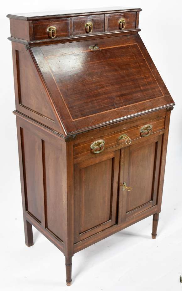 Escrivaninha de madeira nobre com 3 gavetinhas externas, tampo articulado, parte inferior com gaveta e duas portas co...