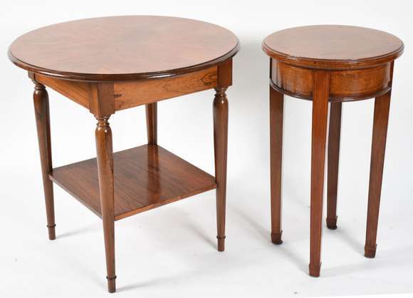 Duas mesinhas auxiliares de madeira nobre, feitio redondo.