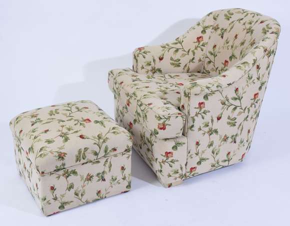 Poltrona com banqueta estofadas e forradas com tecido floral (Retirada em residência no Humaitá).