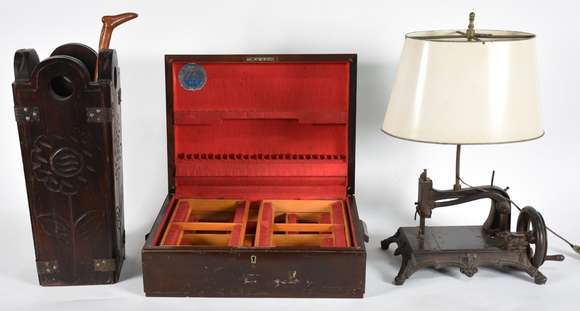 Três peças sendo porta guarda-chuvas de madeira; abatjour com base de maquina de costura; caixa faqueiro.