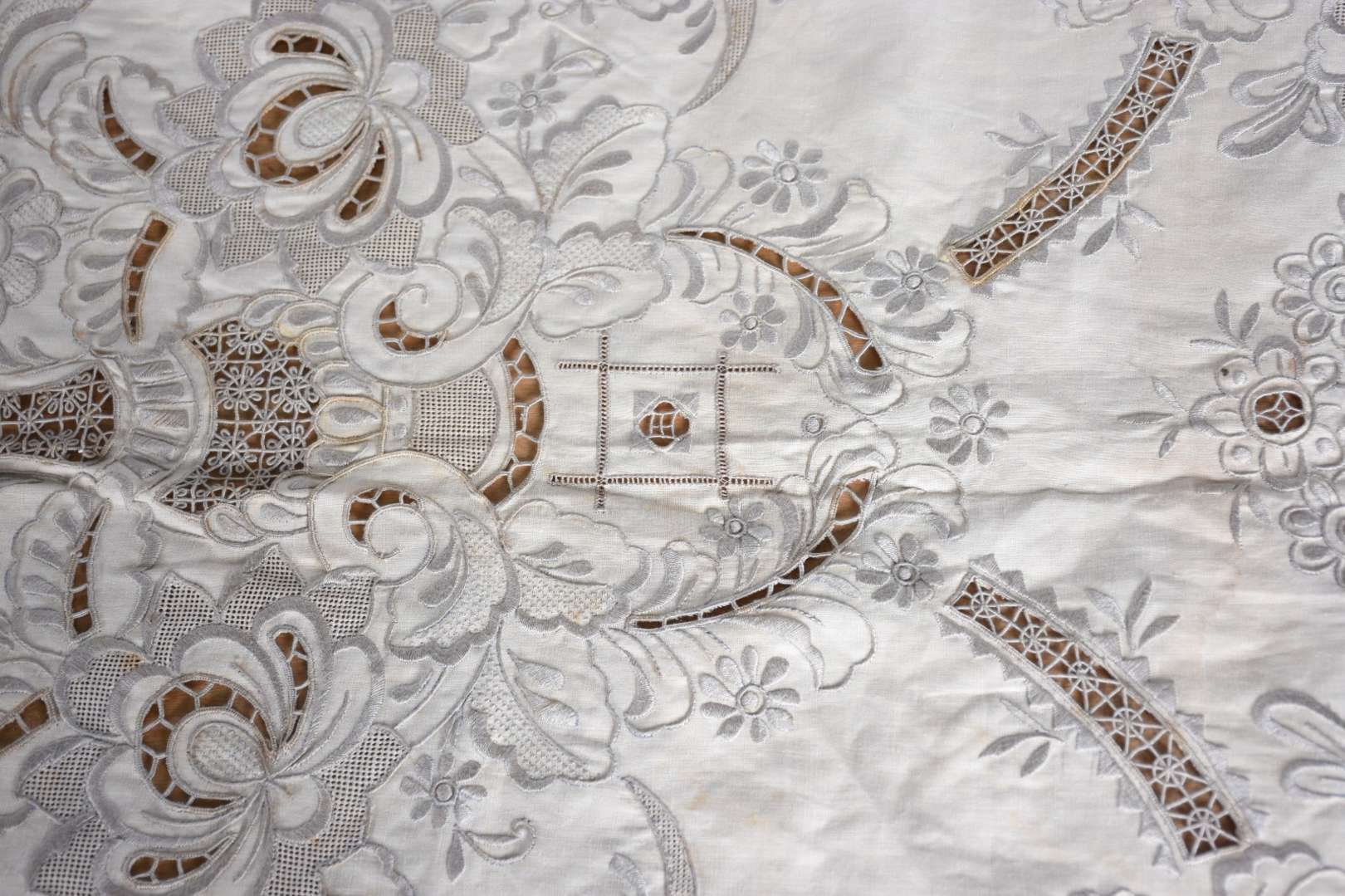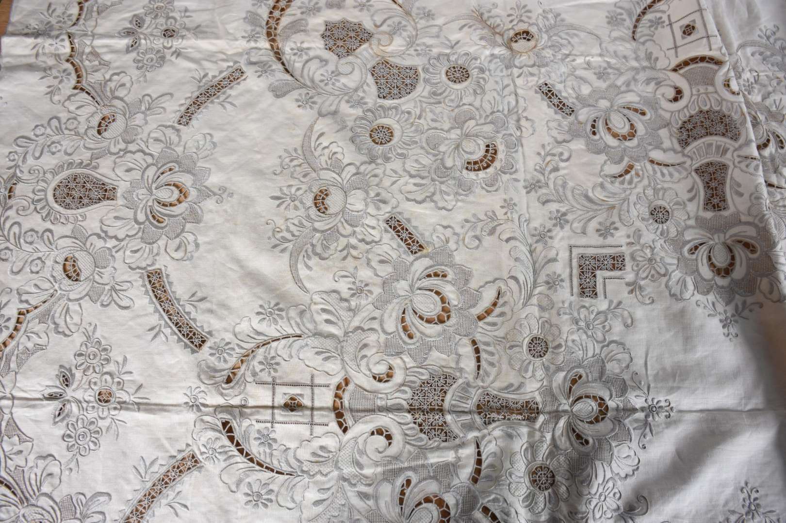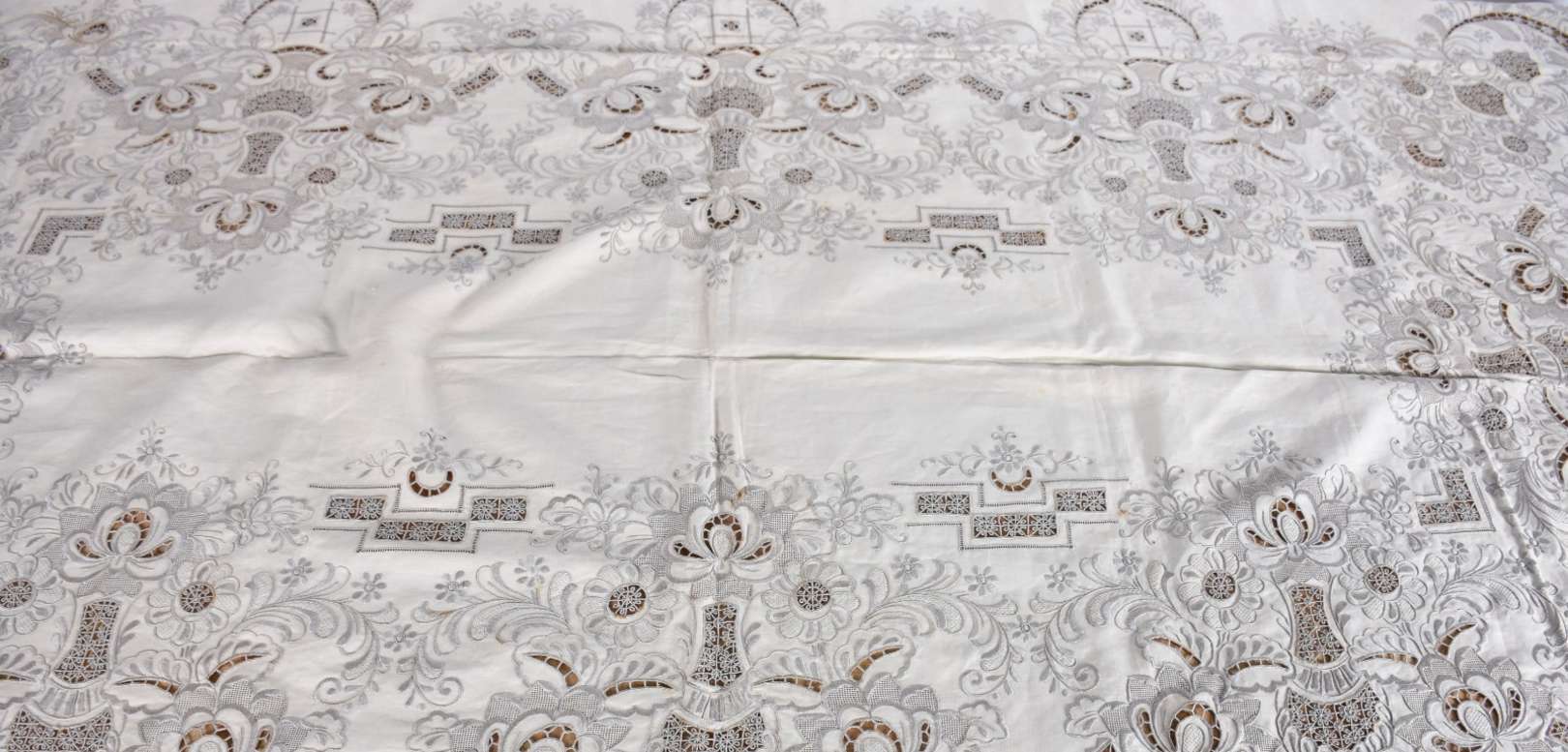 Toalha de mesa da Ilha da Madeira na cor bege com bordados, acompanham 12 guardanapos.
