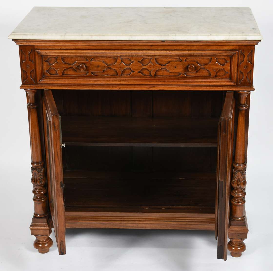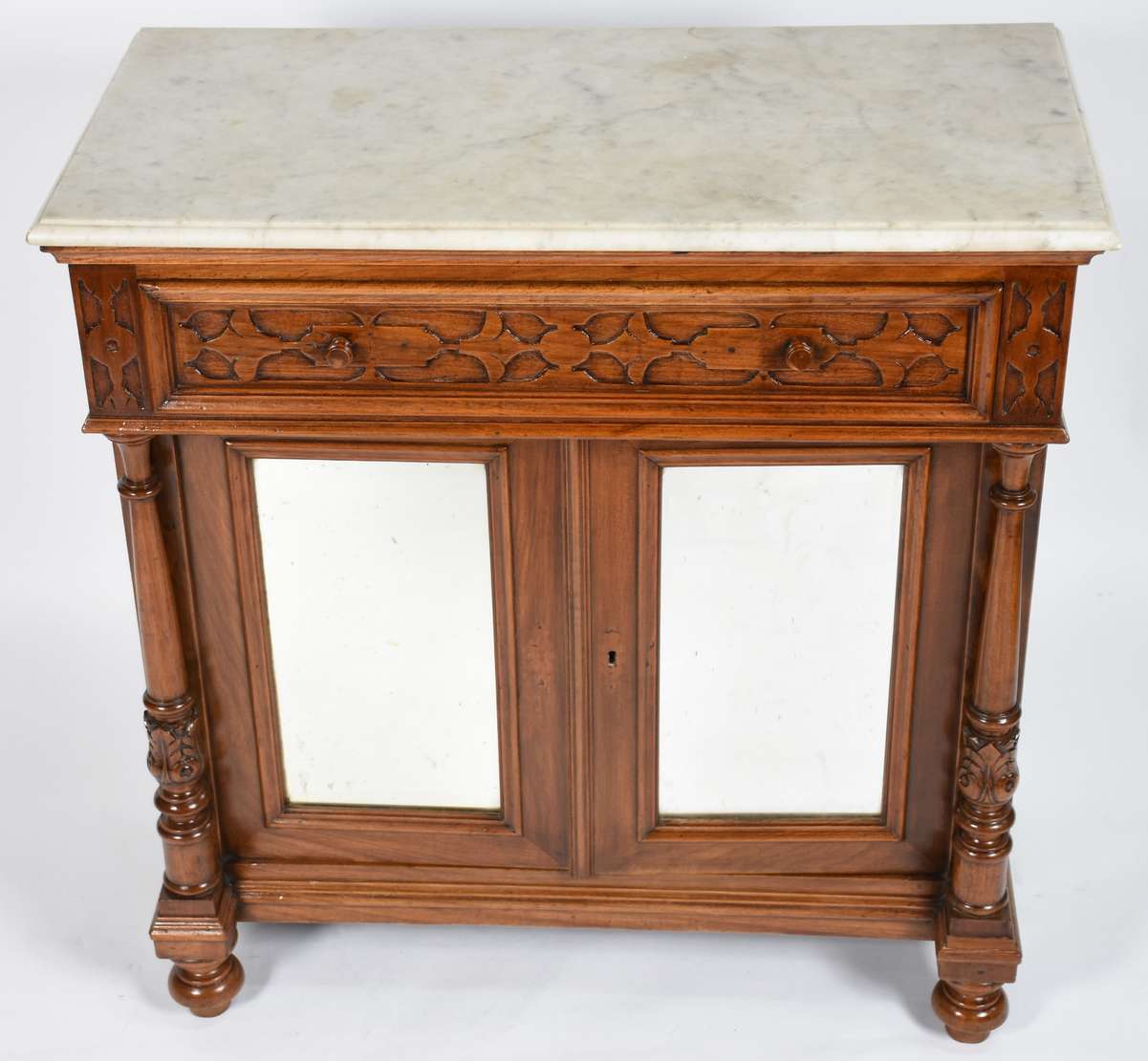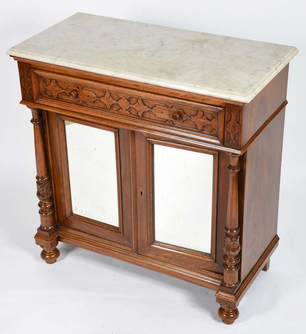 Dunquerque de madeira nobre com tampo de mármore e duas portas espelhadas.