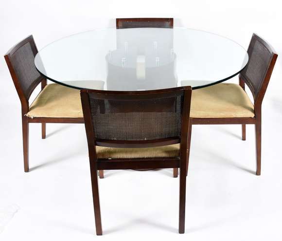 Mesa redonda com tampo de vidro redondo, base de madeira, acompanham 4 cadeiras com assentos estofados (tecido no es...