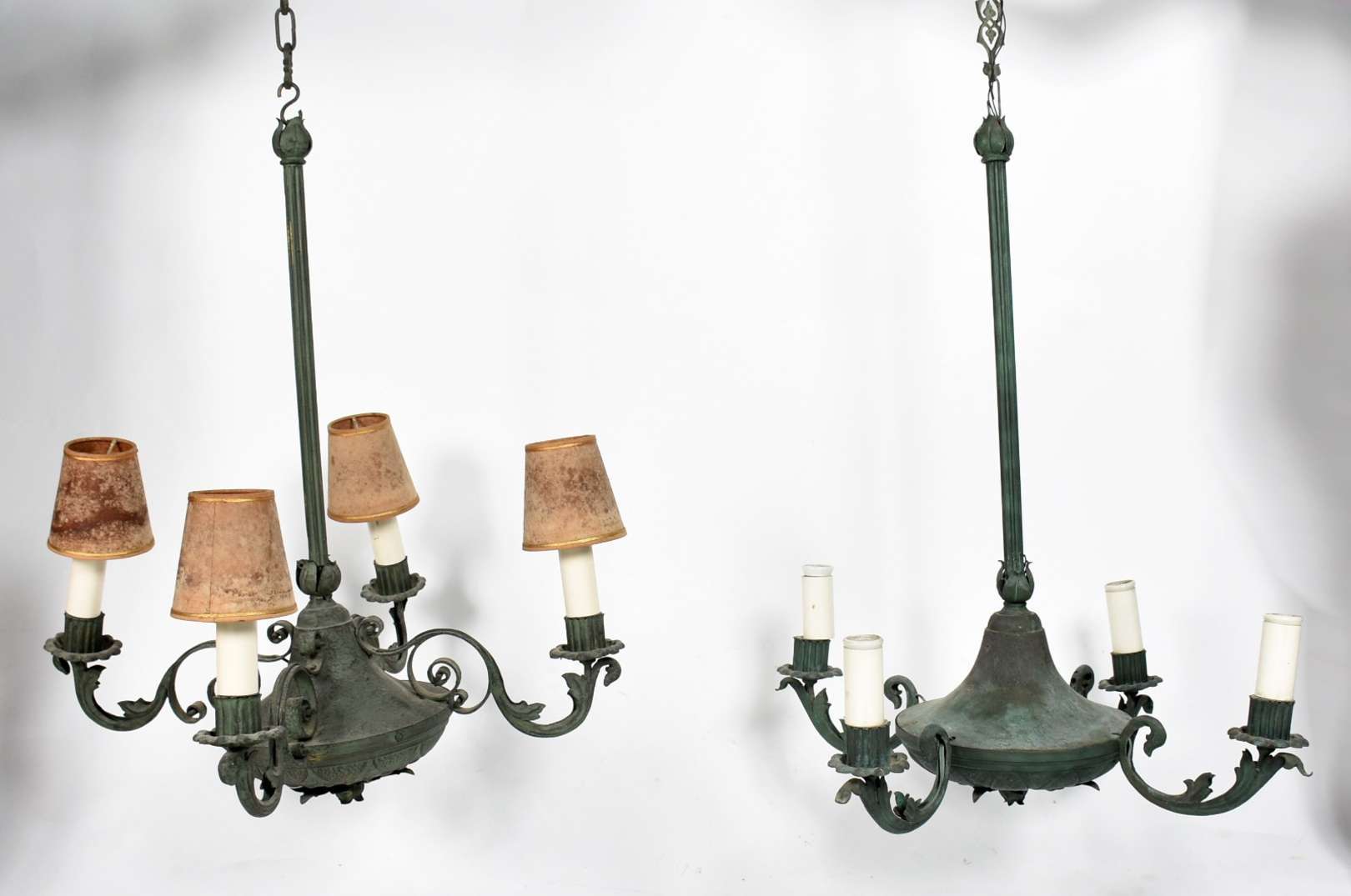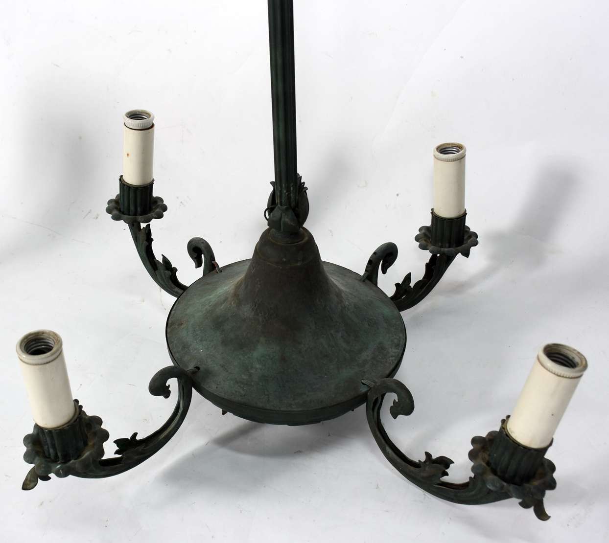 Grande lustre de bronze para nove luzes externas e duas internas, ricamente trabalhado com florões e vazados. Peso to...