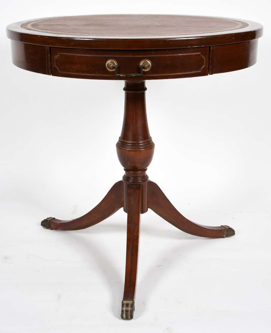 Console de madeira nobre com tampo dobrável, apoio em coluna central terminando em tres pernas recurvas, estilo Impér...