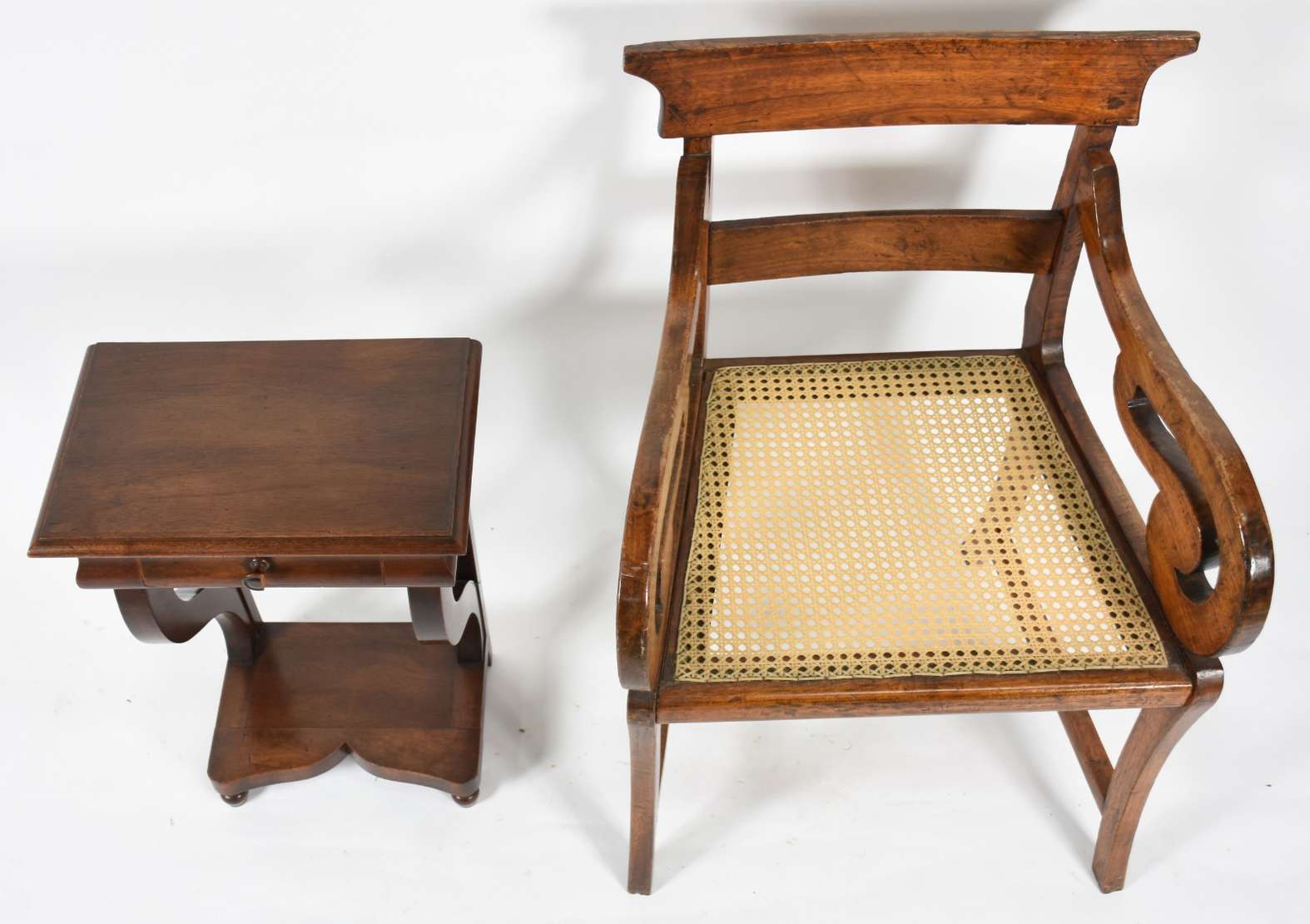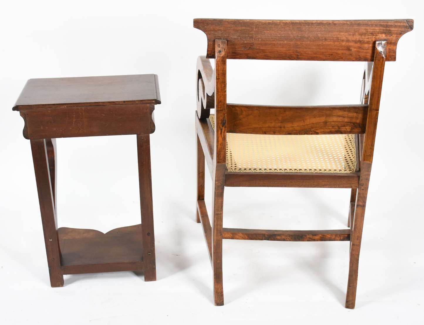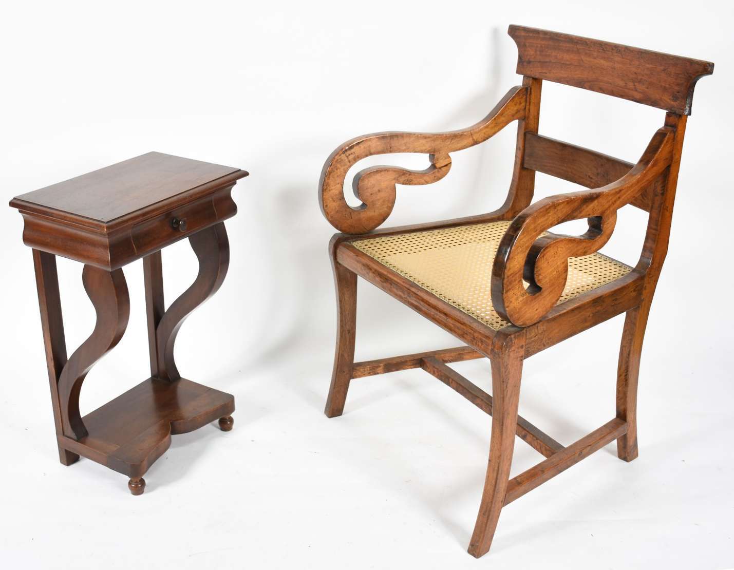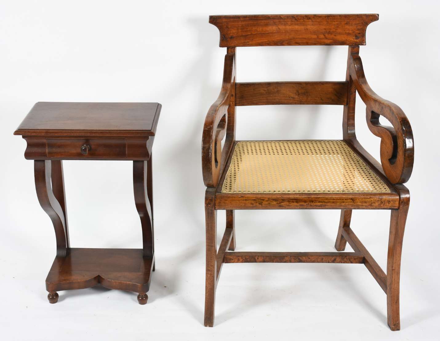 Mesa auxiliar feitio quadrado de madeira nobre, uma gaveta, pernas retas ligadas por traves inferiores.