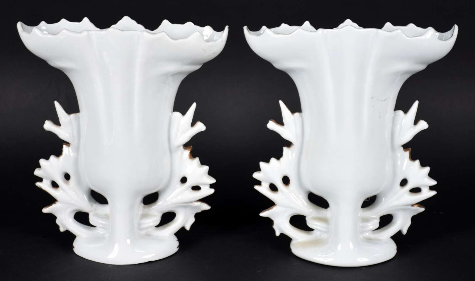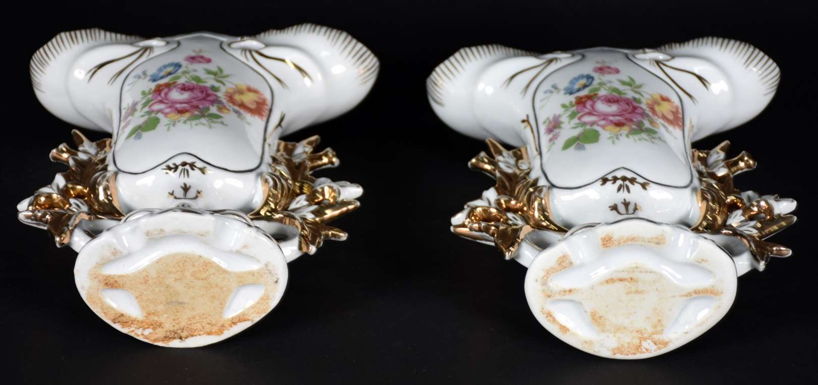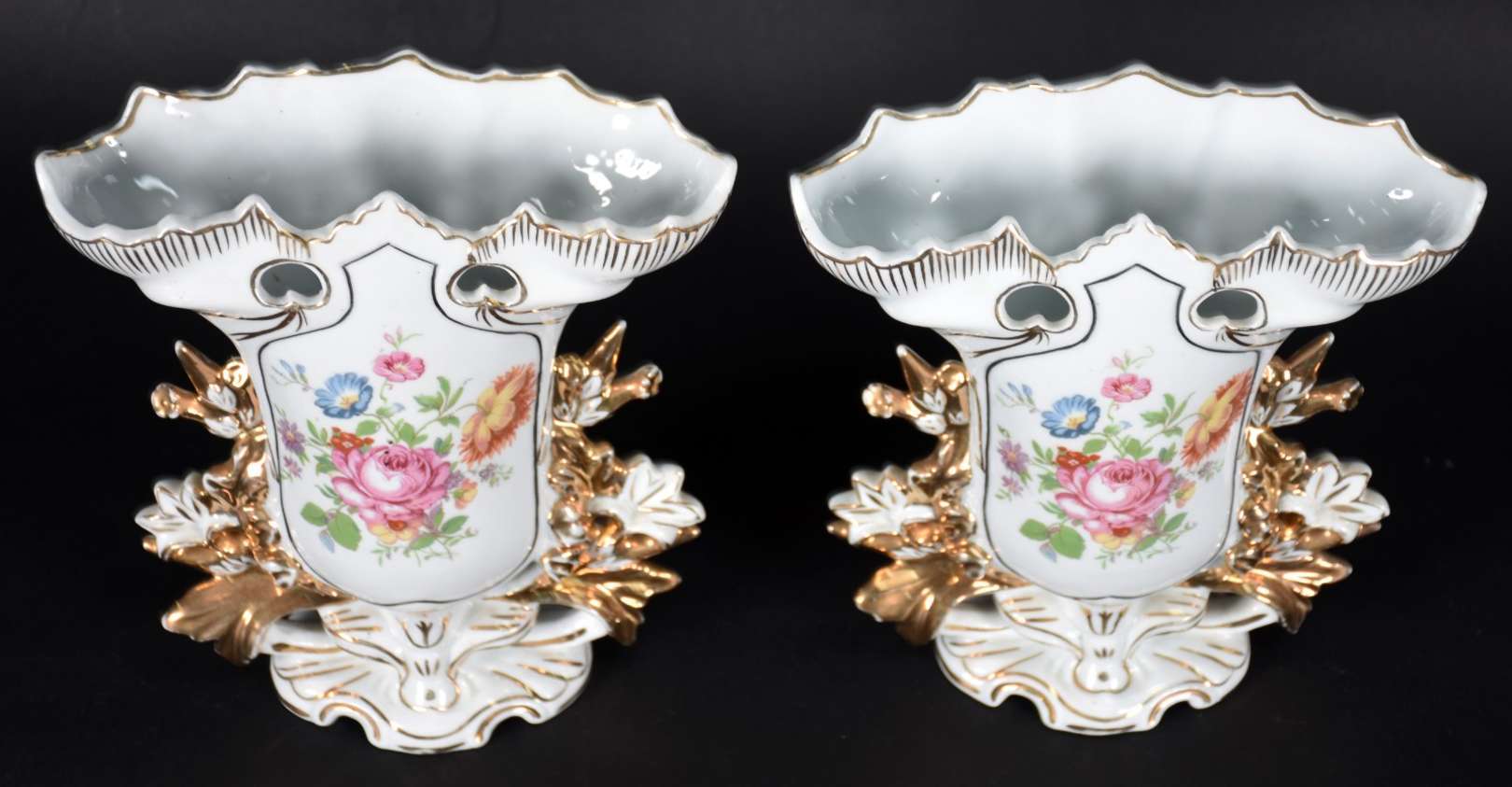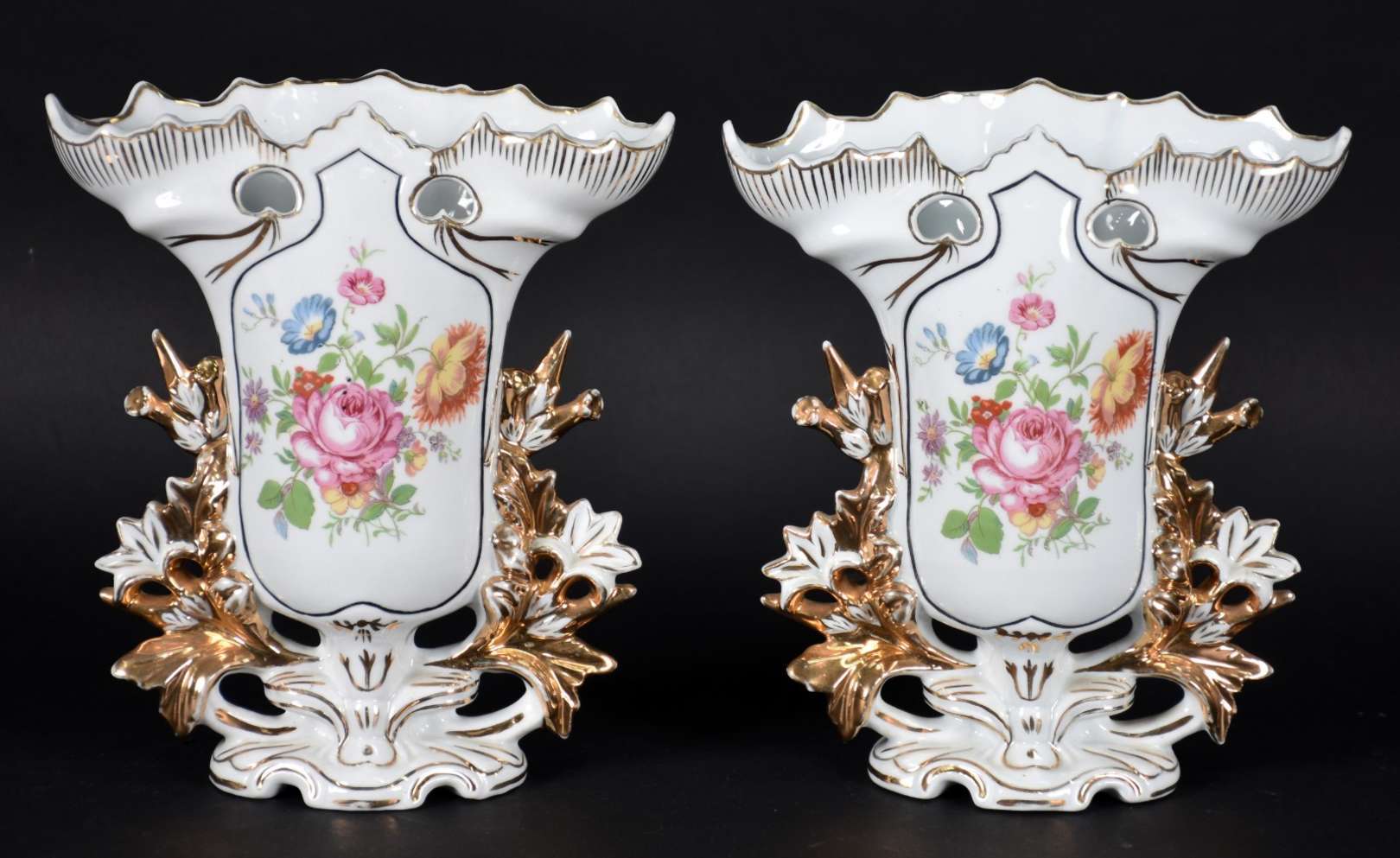 Vaso de porcelana com flores em policromia e borda recortada com realces dourados, marca na base "Teixeira".