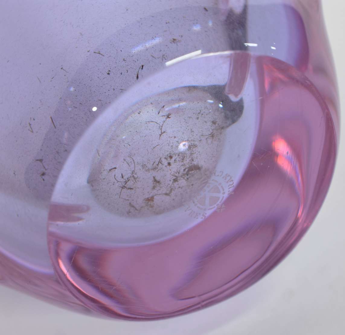 Grande jarra de vidro decorativo na cor lilás com mesclas em branco e preto e "pingos derretidos" na borda.