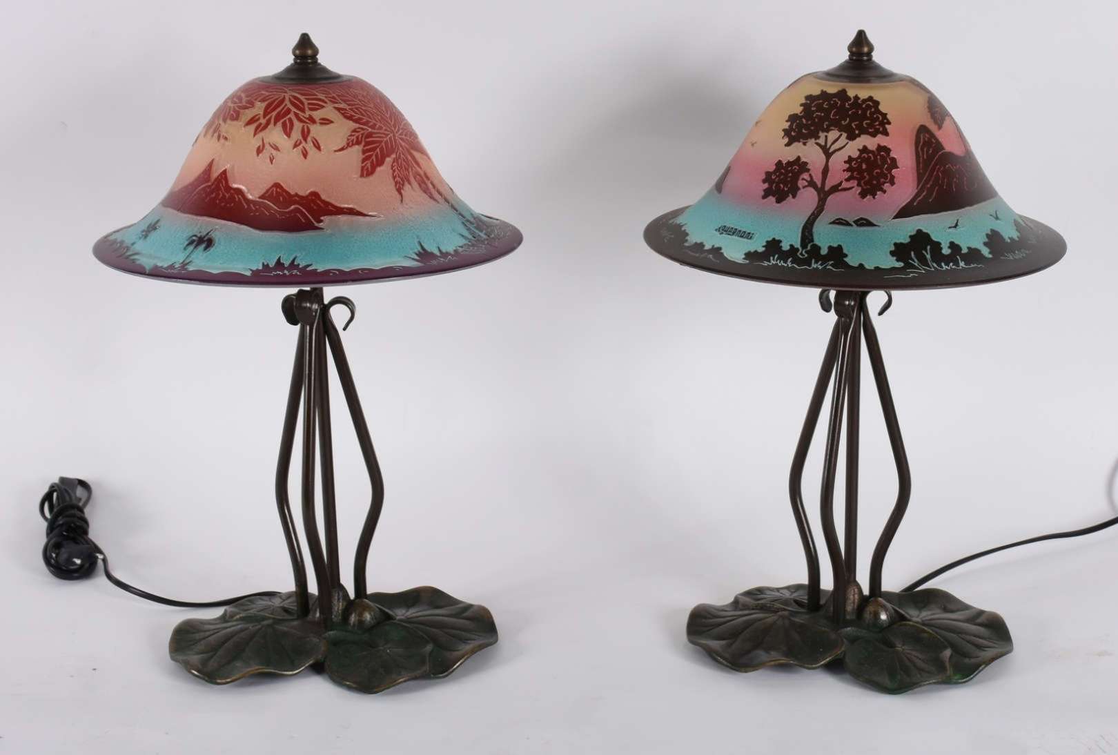 Abatjour estilo Tiffanys com base de metal, cúpula em placas de pasta de vidro colorida.