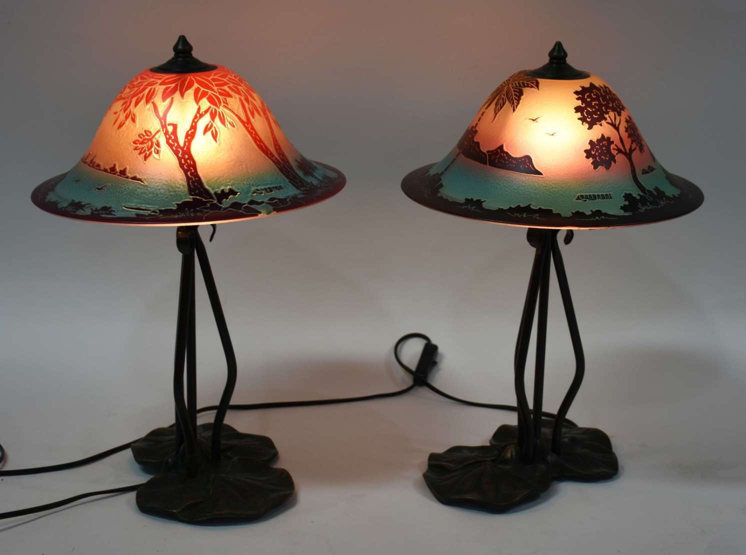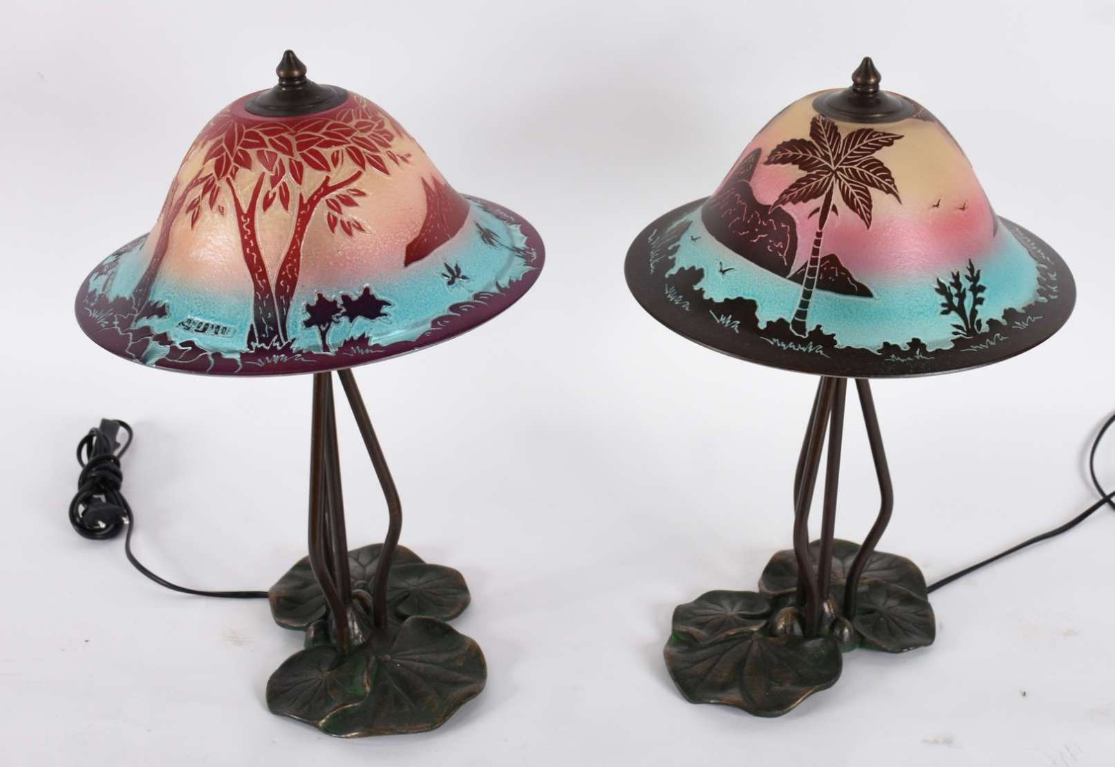 Par de abatjoures de madeira entalhada com cúpulas na cor bege. Altura Total 98 cm.