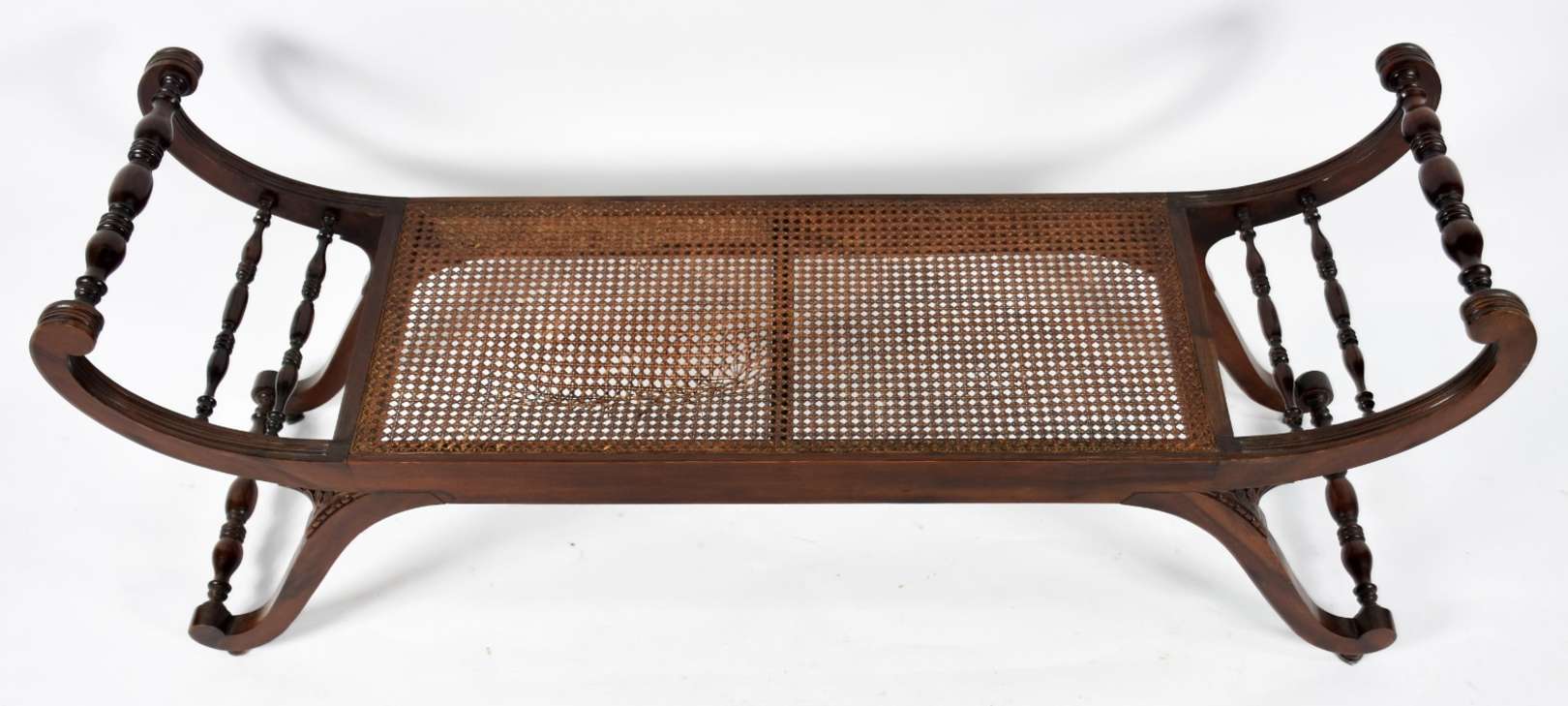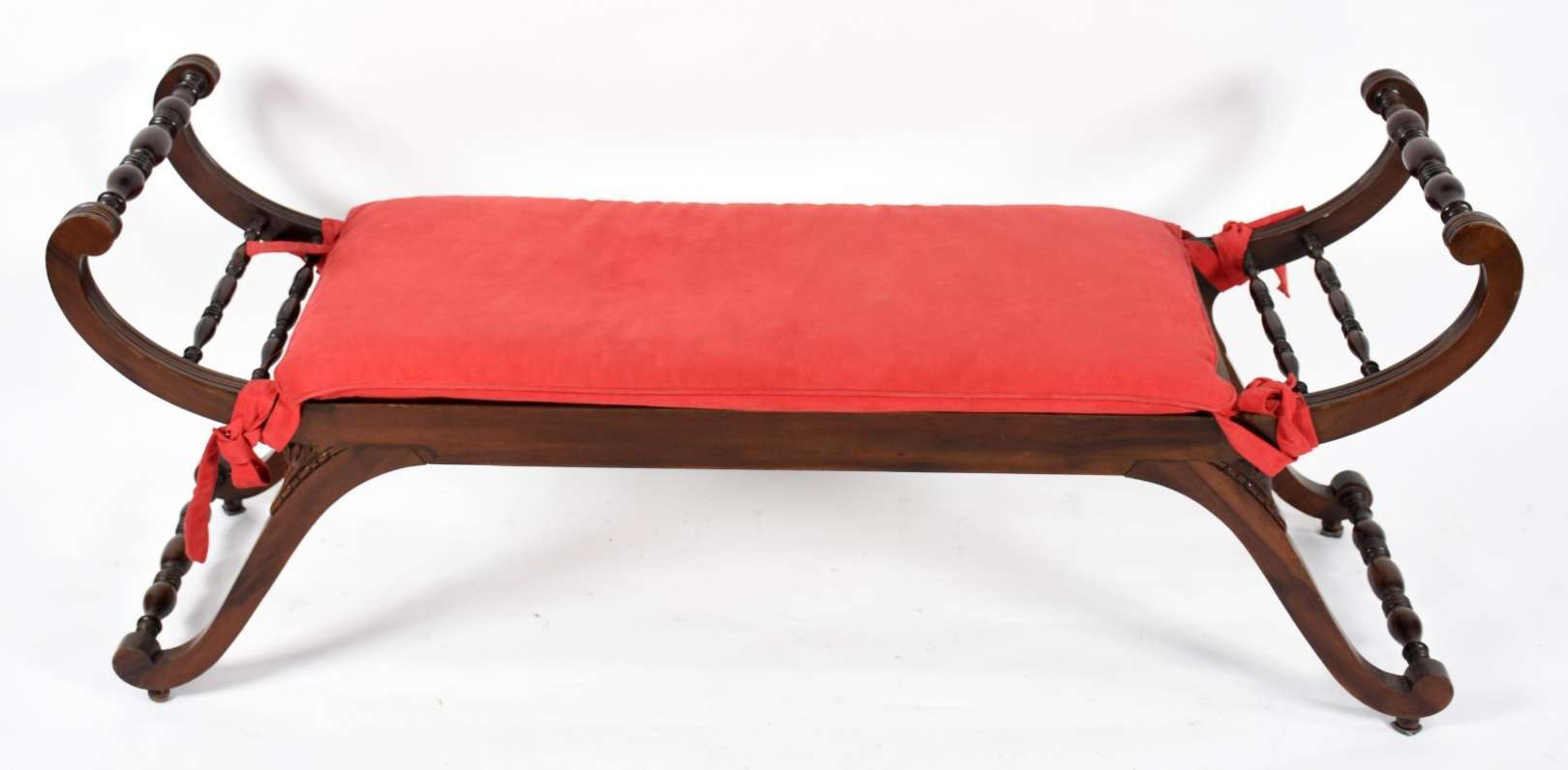 Console de madeira nobre com tampo dobrável, apoio em coluna central terminando em tres pernas recurvas, estilo Impér...