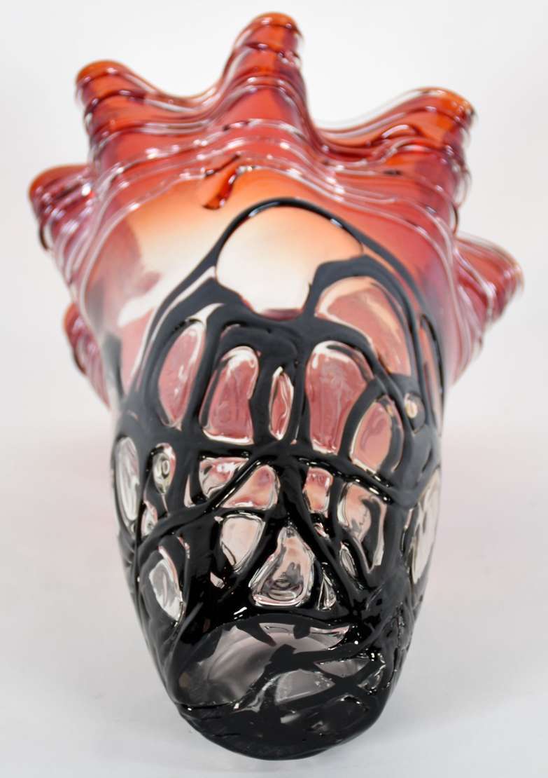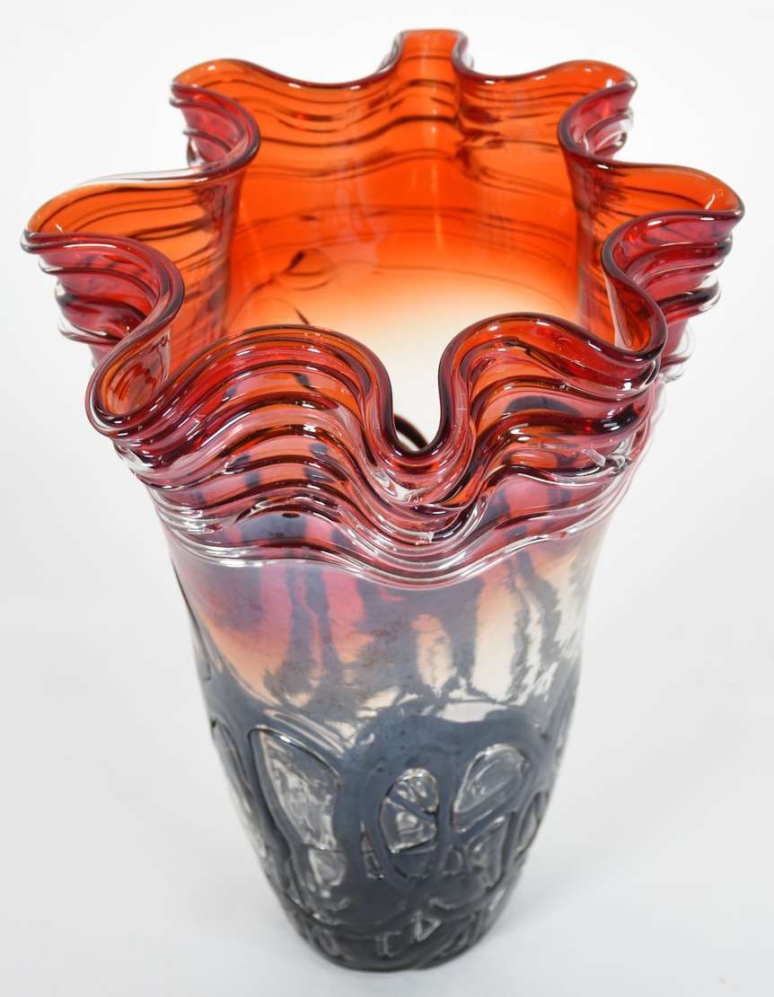 Grande jarra de vidro decorativo na cor lilás com mesclas em branco e preto e "pingos derretidos" na borda.